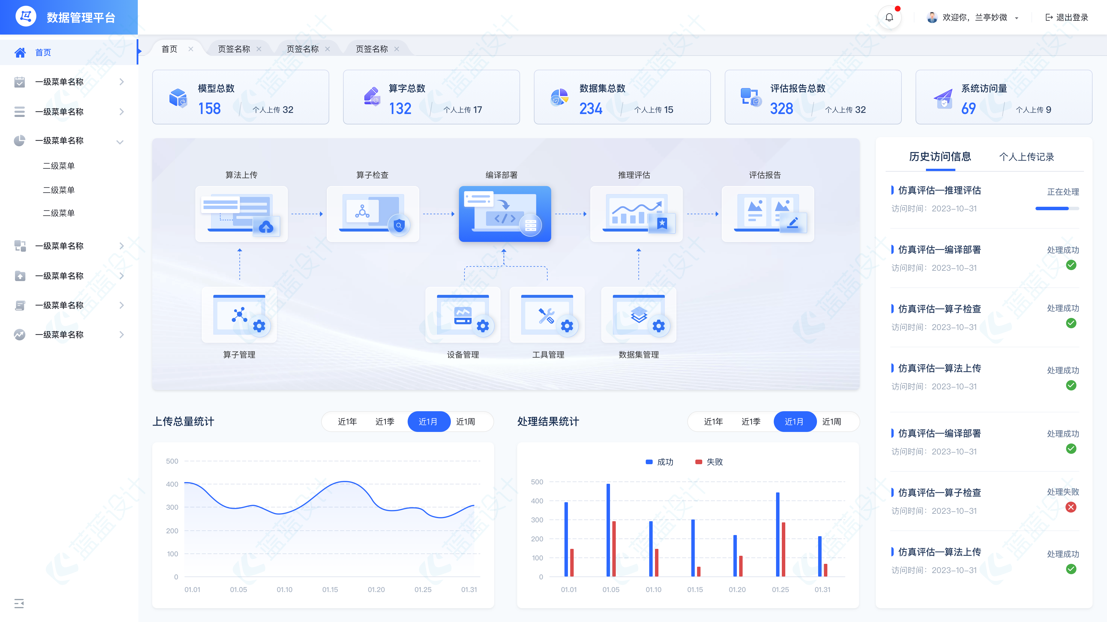 該系統的原首頁中信息量比較少,在設計時除了對頁面美觀的優化,從內容、布局、用戶使用場景、使用習慣、交互方式等方 面也進行考慮,增加了一些統計的圖表, 「歷史訪問信息」采用卡片式列表,突出模塊和內容。同時增加「個人上傳記錄」信息和「歷史訪問信息」可以進行 切換查看。