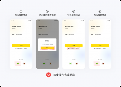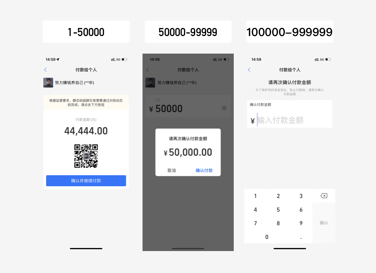 業(yè)務場景123主要應用金額輸入框組件,輸入框組件根據(jù)用戶操作行為,會有不一樣的設計,用戶沒有任何操作,輸入框內有默認文案提示“輸入付款金額”,用戶輸入金額后,計算單位超過‘百’,數(shù)字金額上方會有單位提示,同時顯示刪除按鈕,支持刪除,重新輸入,業(yè)務場景2中根據(jù)金額輸入范圍定義了產(chǎn)品業(yè)務規(guī)則,再細分出三種場景,不同范圍內的金額,可以對應的組件設計方案解決確認轉賬確認問題;