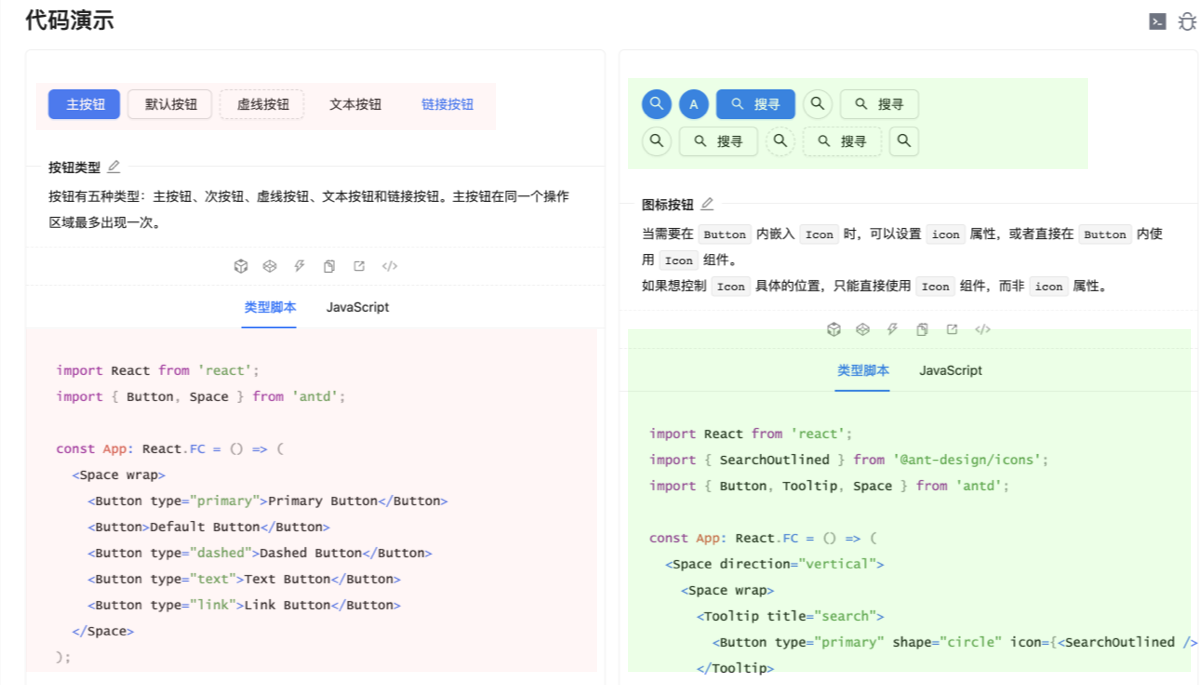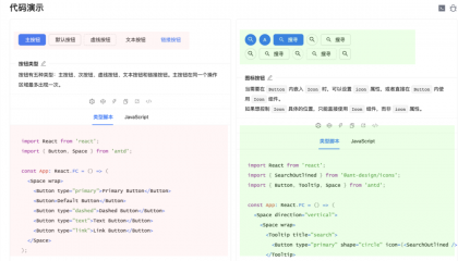 組件和組件庫的設計和搭建過程中,需要了解系統(tǒng)平臺,是蘋果端還是安卓,web端,不同的系統(tǒng)設計的差異性很大,對應系統(tǒng)的控件類型我們也要很熟練的掌握。例如安卓一直保留的原生的底部導航欄的操作控件(返回、主頁、菜單),反觀蘋果最早出現(xiàn)在底部的HOME鍵,隨著硬件設計的升級,物理按鈕的作用已經(jīng)完全被交互手勢操作替代,根據(jù)設計準則,可以先設計出確定的初版組件樣式,然后設計師們要熟悉項目業(yè)務,深挖每個功能中的不同業(yè)務場景,并設計出對應的業(yè)務組件;這樣設計師最終對于當前組件進行整合分類,做出版本的組件庫;組件和組件庫是設計和開發(fā)相結合的,設計師呈現(xiàn)頁面上的模塊是直觀的,但都是技術人員進行底層代碼拼接的再封裝而成的,有規(guī)模的公司一般都會做成開源的組件庫。去提升項目人員之間的協(xié)作效率,復用率高,節(jié)省成本。如下圖是Ant design里面的部分按鈕組件的樣式和代碼演示,作為國內獨一檔的免費學習的設計體系網(wǎng)站。如果大家能夠從頭到尾研究一遍,相信對你構建組件和組件庫有十分大的幫助。