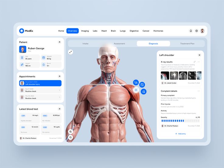 • 設計邏輯:面向患者或健康管理用戶,通過具象化的人體模型、直觀的健康數據圖表、流程化的交互設計(如病情關聯、健身計劃生成),降低專業信息的理解門檻,打造友好、易用的健康管理或健身指導體驗,兼顧信息整合與用戶交互的流暢性。