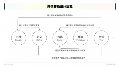 最后便是共情結果如何應用到設計之中,將共情結果賦能到產品設計也是共情工作的價值所在。通常這套流程是共情->定義->構思->原型->測試,在這個整個過程中隨時是可以返回到前面其他階段中反復打磨的,而共情作為一個起點也揭示了其重要性。我們一切的共情工作皆為了能夠優化和解決產品的問題,使得產品體驗能夠更好,這是我們在體驗設計中不斷去共情的初衷。