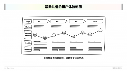 圖表、筆記、錄制設備是幫助我們共情的最好工具,在不同的場景下,這些工具能夠幫助我們更好的收集信息,并且便于我們思考和共情。我們在短時間能記住的信息是有限的,這也是為什么我們會用到7±2這種定律去控制信息量的原因。以用戶體驗地圖為例,在記載用戶體驗產品的過程中,便是一種很好的共情輔助工具,它能夠按照使用步驟或階段記載用戶使用情況和情緒變化等反饋。