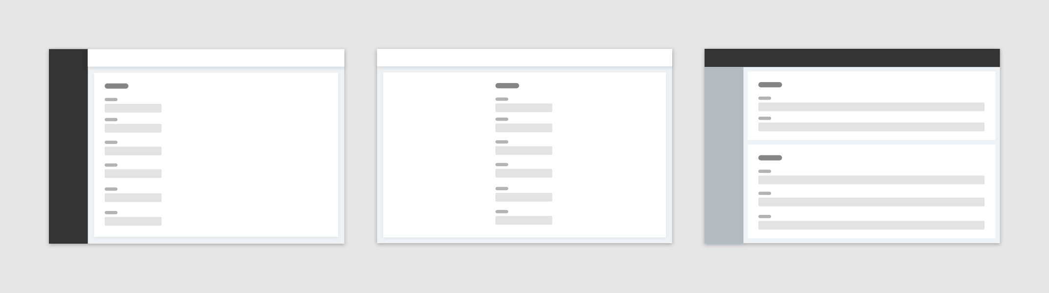 卡片分組布局一般用來處理高復(fù)雜類型表單。當(dāng)業(yè)務(wù)中希望頁面承載眾多表單字段時(shí),可將信息相關(guān)性弱的字段拆分為多個(gè)部分,并通過多個(gè)卡片分組承載不同類型字段,每個(gè)卡片都需有個(gè)卡片類別標(biāo)題。