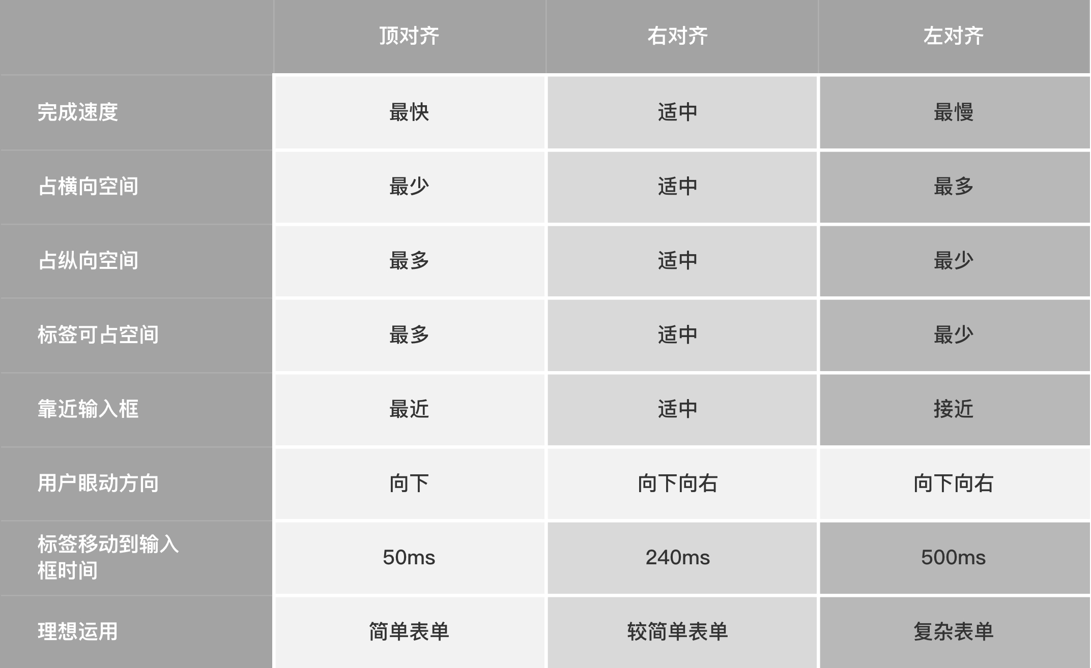 在設(shè)計(jì)表單時(shí)到底是左對齊、右對齊還是頂部對齊呢?這個(gè)問題也是在實(shí)際業(yè)務(wù)中設(shè)計(jì)師發(fā)問頻率較高的一個(gè)棘手問題。其實(shí),不論是哪種方式都有相對的利弊,需要根據(jù)實(shí)際業(yè)務(wù)場景提供不同的解決方案。在Matteo Penzo《Label Placement in Forms》文章中有分享過關(guān)于表單標(biāo)簽放置的研究,下圖是Matteo Penzo研究總結(jié)得到的瀏覽時(shí)間表:
