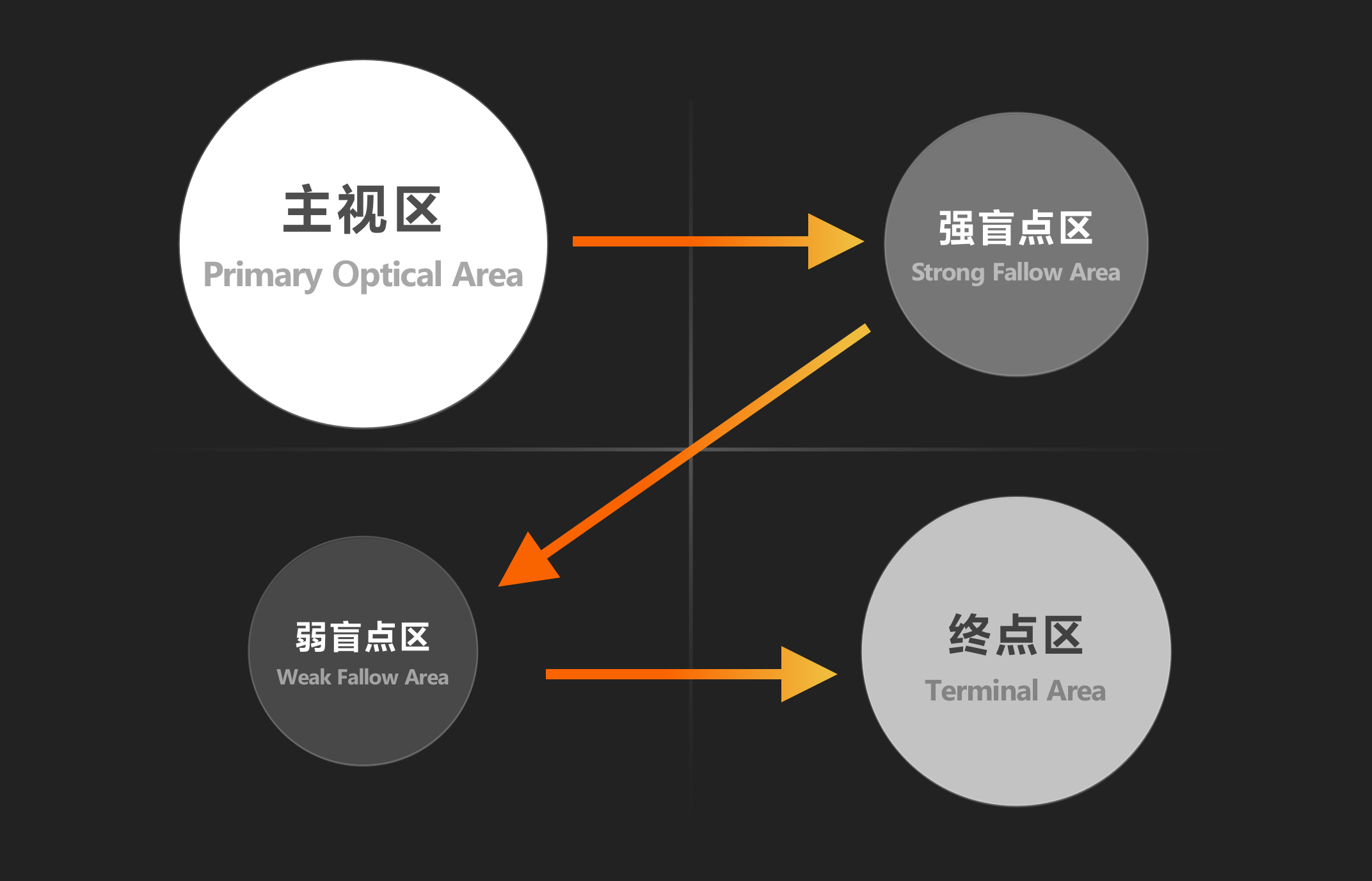 所以,界面中的左上和右下是用戶視覺最為重點(diǎn)關(guān)注的位置。遵循古騰堡法則,設(shè)計(jì)師應(yīng)該把界面的關(guān)鍵元素放在主視區(qū),終點(diǎn)區(qū)可以放按鈕、強(qiáng)提示,盲點(diǎn)區(qū)可以用來放一些相對次要的內(nèi)容,如輔助圖形、文字信息。