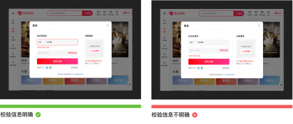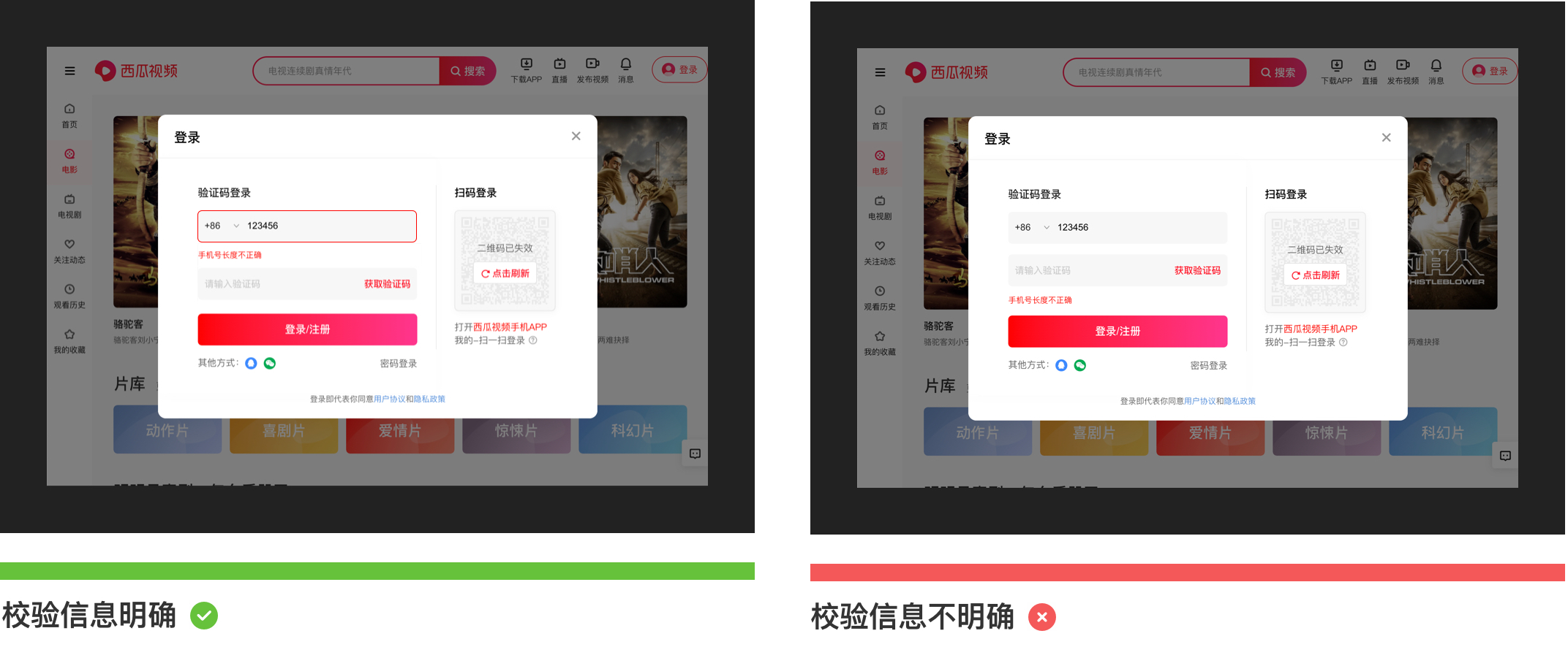 錯(cuò)誤校驗(yàn)提示一般存在于錯(cuò)誤率較高情況下出現(xiàn),如:在登錄注冊時(shí),要求用戶填寫手機(jī)號,如果用戶輸入的手機(jī)號碼不符合特定的輸入格式,那么這時(shí)候需要明確標(biāo)記錯(cuò)誤原因,準(zhǔn)確的幫助用戶找到問題并解決,避免錯(cuò)誤提示描述模糊不清誤導(dǎo)用戶。錯(cuò)誤提示一般會采用“雙重視覺強(qiáng)調(diào)”來顯示錯(cuò)誤,除了輸入框突出顯示外,同時(shí)需要在輸入框下方加入紅色指導(dǎo)文字。如下圖所示為西瓜視頻登錄注冊場景下的截圖: