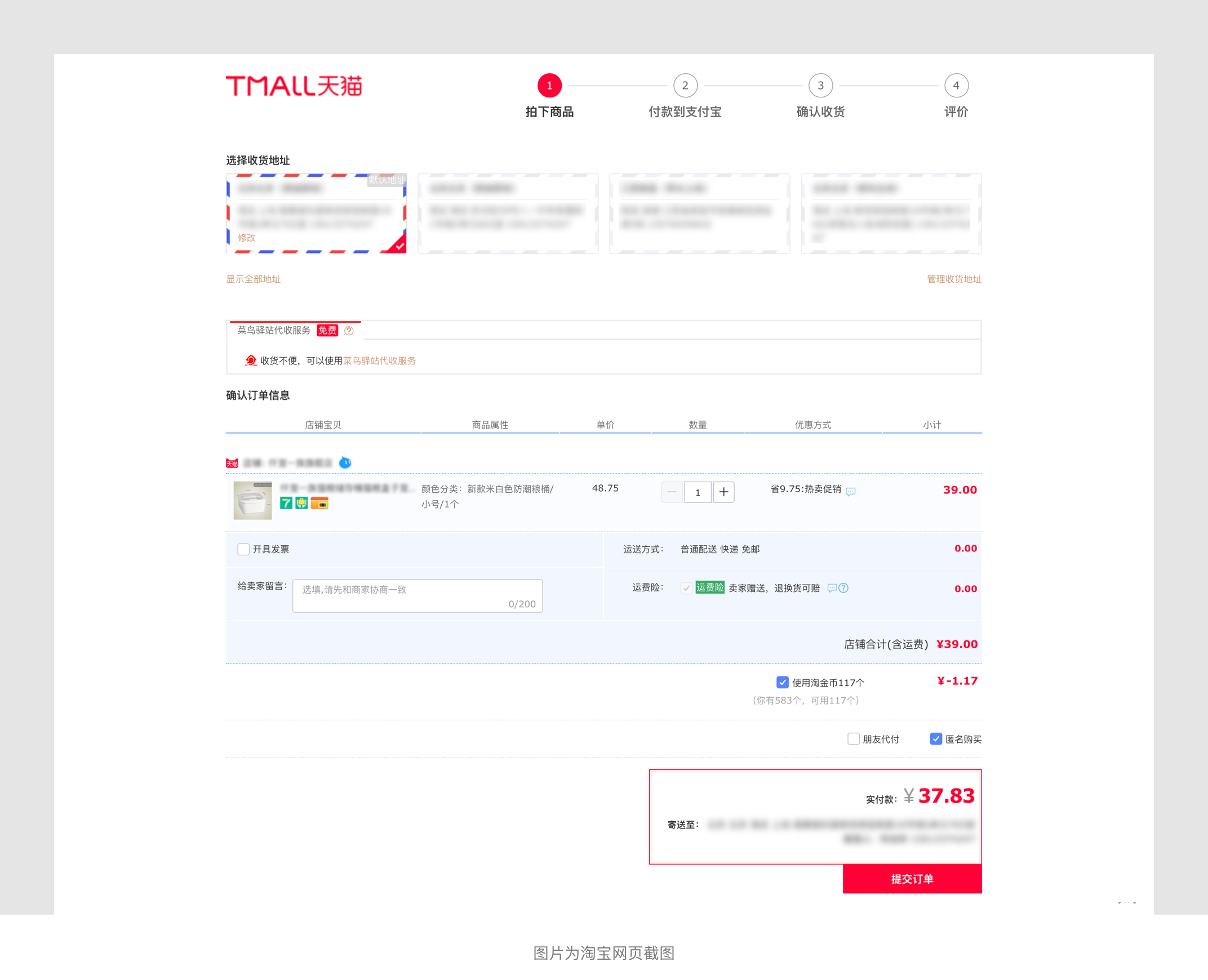 我們以淘寶來舉個(gè)典型的例子,淘寶屬于國民電商平臺也是亞洲較大的網(wǎng)上交易平臺,提供各類優(yōu)質(zhì)商品。從平臺的特性來講,它以用戶下單并成交作為最終目標(biāo)。其中支付表單起著一個(gè)關(guān)鍵的作用,用戶從購買到支付完成以分步形式進(jìn)行,第一步填寫基本信息并提交訂單,第二步選擇商品并選擇支付貨款至第三方,第三步買方確認(rèn)收貨并自動打款給商家,第四步完成訂單并評價(jià)。在填寫表單時(shí)中間沒任何阻斷,用戶能很順利的按步驟完成訂單。淘寶支付表單屬于比較典型的分步表單。