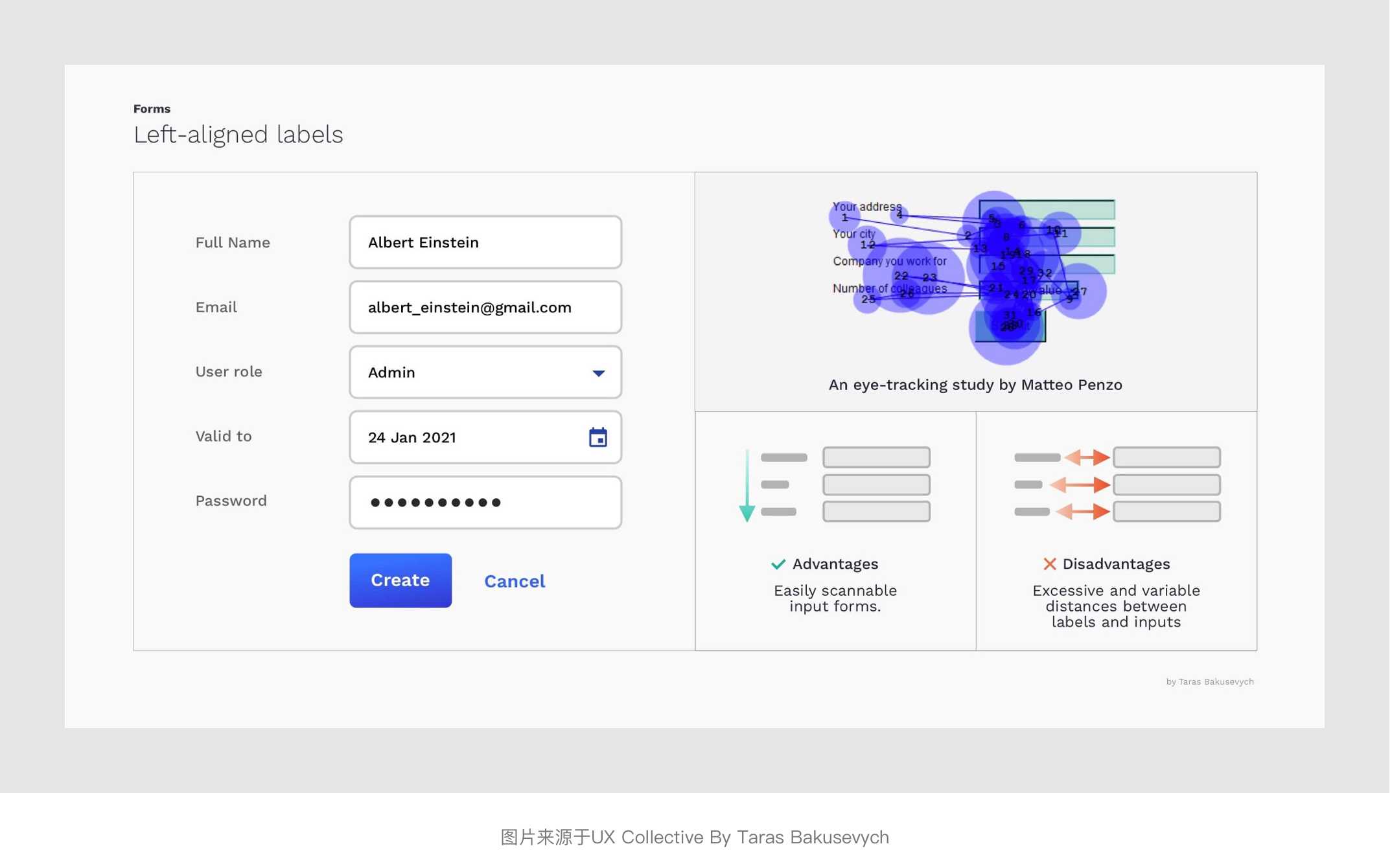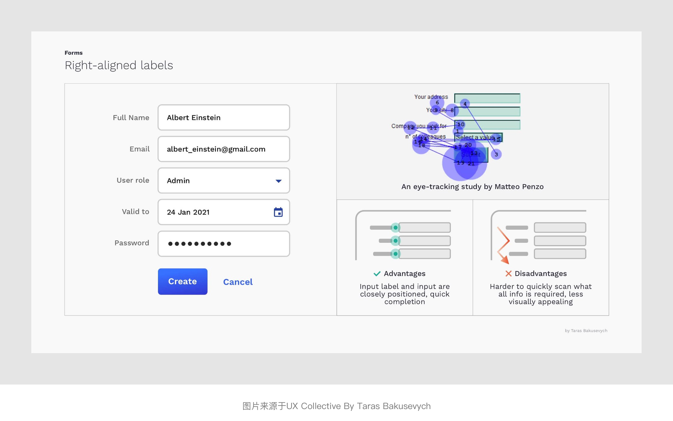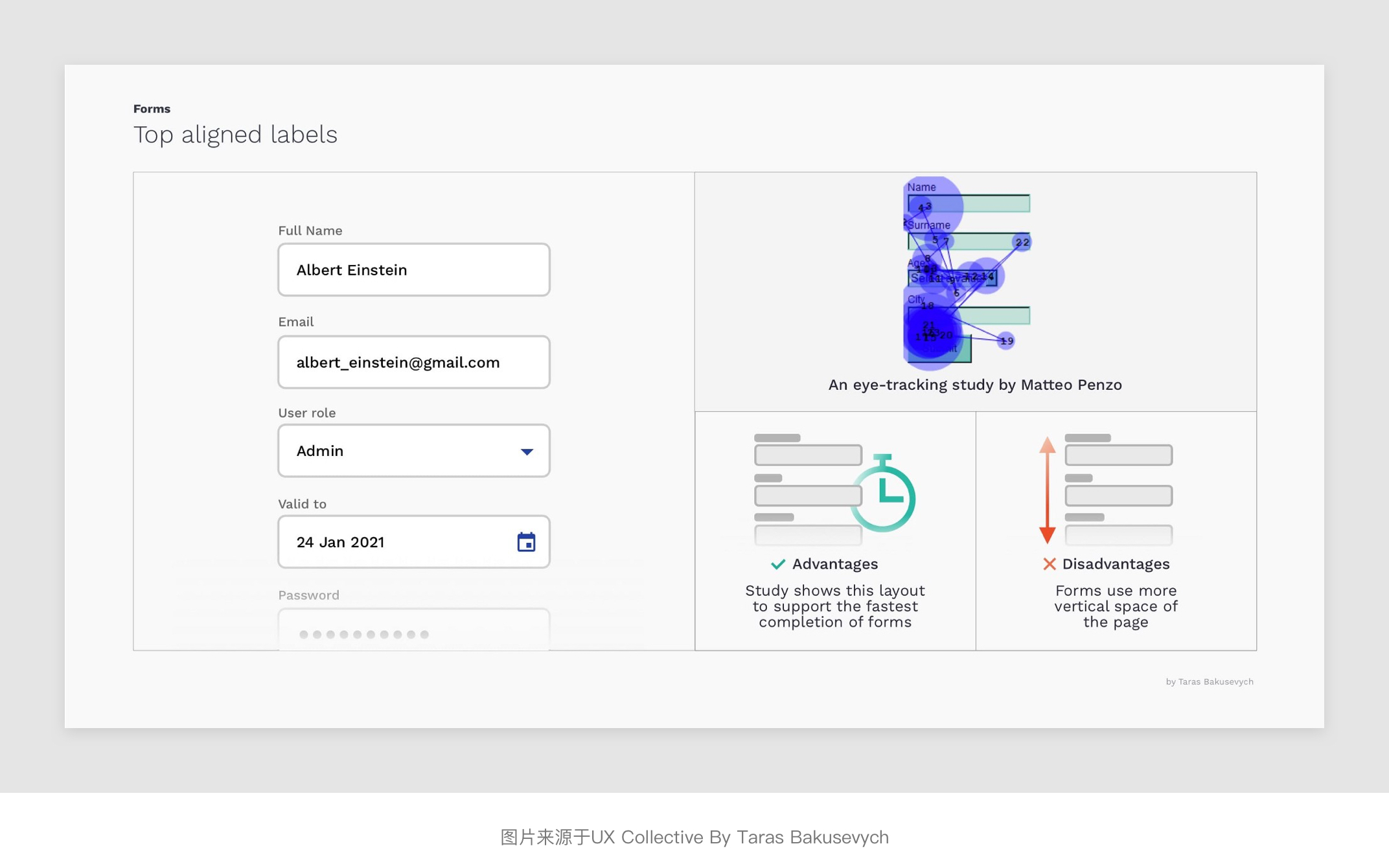 將表單標(biāo)簽放置在其對應(yīng)輸入字段的正上方,并垂直左對齊排列,用戶只需依次向下瀏覽即可看到標(biāo)簽與輸入字段兩個(gè)元素。其優(yōu)勢是橫向屏幕空間足夠,能夠比較友好的適配多語言適合非中國區(qū)業(yè)務(wù)表單使用。并且根據(jù)上面Matteo Penzo的時(shí)間表上看,頂部對齊的瀏覽和填寫的效率也是3種常規(guī)的對齊方式中較高的一種。不足點(diǎn)是會占用較多的縱向垂直屏幕空間,此外應(yīng)當(dāng)注意每組表單標(biāo)簽和輸入字段與其他字段組的間距,以免層級區(qū)分度不夠的問題。