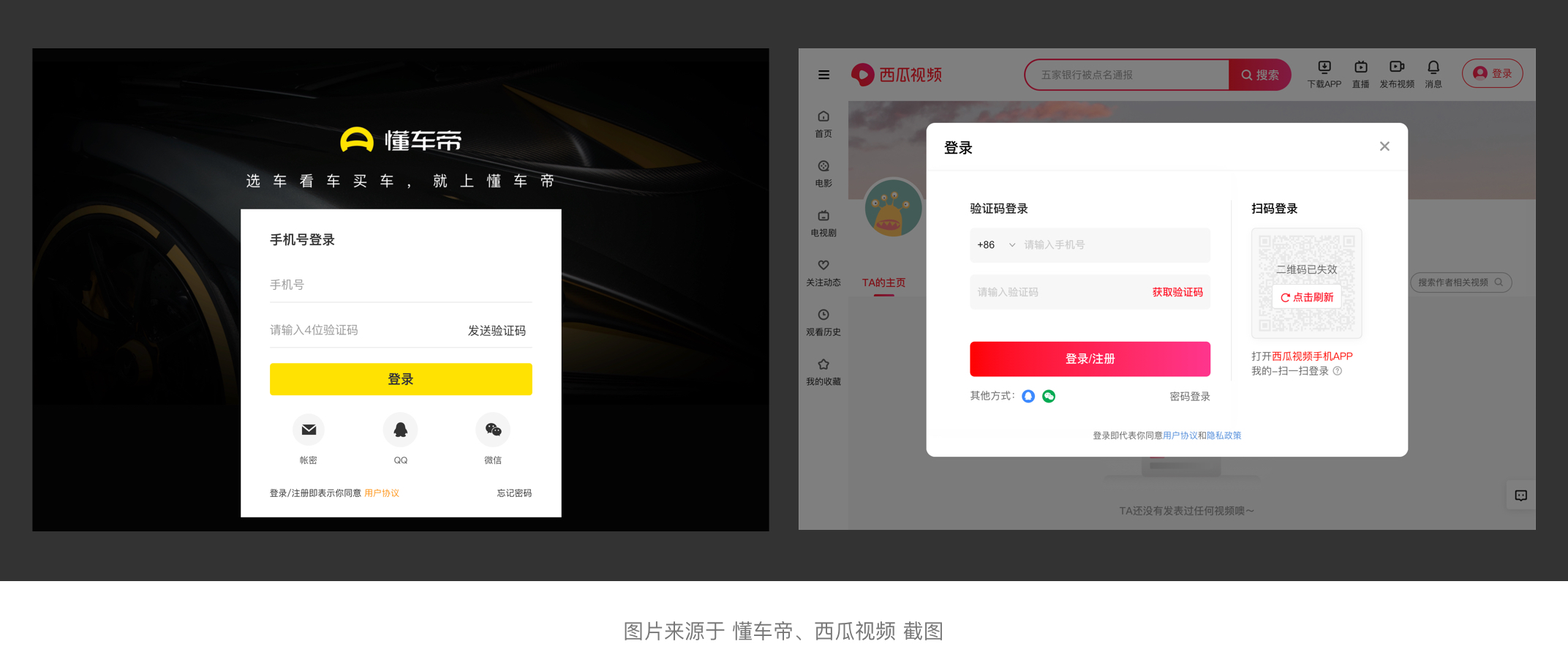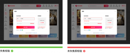 為了避免用戶在提交時(shí)表單時(shí)出現(xiàn)大面積的報(bào)錯(cuò)問題,設(shè)計(jì)師可以使用實(shí)時(shí)校驗(yàn)的交互形式。如:在用戶輸入完成之后鼠標(biāo)失焦后進(jìn)行信息校驗(yàn),但是需要注意的是在實(shí)時(shí)校驗(yàn)時(shí)避免用戶還沒有輸入完成即出現(xiàn)校驗(yàn)誤導(dǎo)用戶,所以需要準(zhǔn)確判斷鼠標(biāo)是否失焦。如下圖所示為西瓜視頻登錄注冊場景下的截圖: