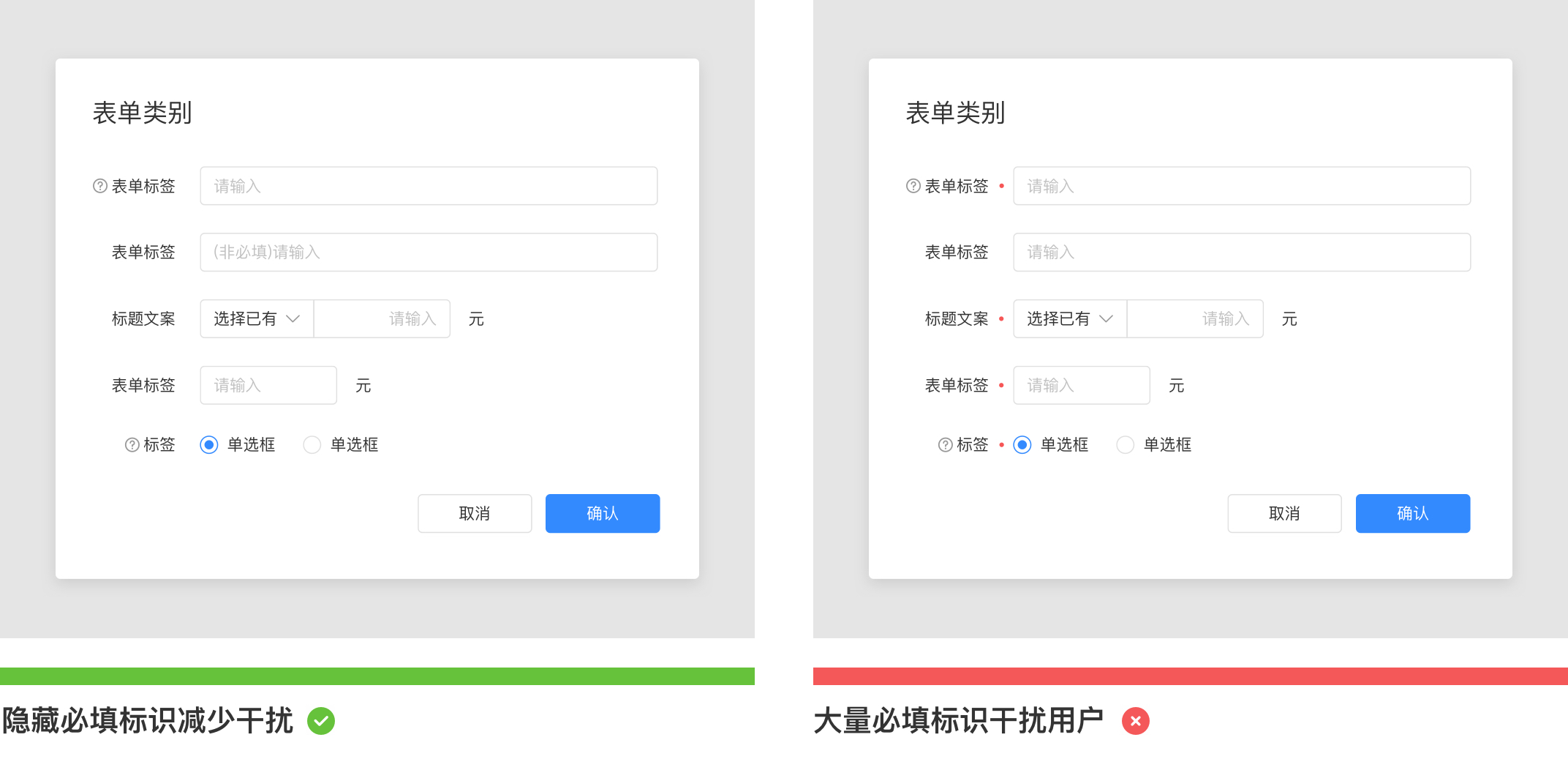 還有一點(diǎn)是表單中視覺噪聲越少可讀性越強(qiáng),因此當(dāng)必填項(xiàng)多于非必填用非必填字段提示用戶會更好。