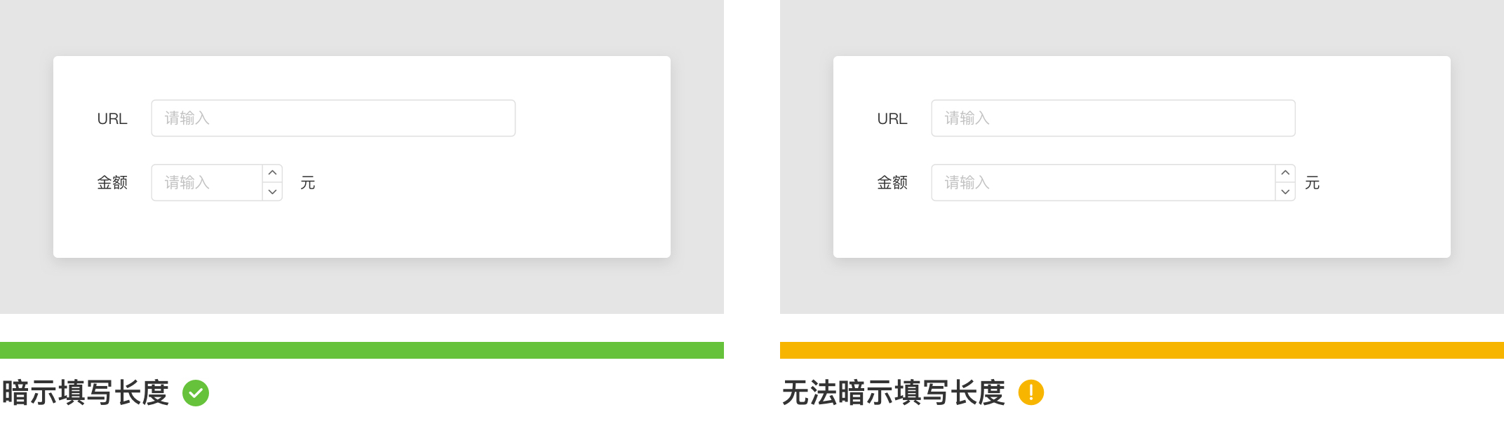 在實(shí)際業(yè)務(wù)中,設(shè)計(jì)師常常習(xí)慣把每個(gè)表單字段都設(shè)置成相同的寬度,在視覺效果上看感覺會比較統(tǒng)一,但是這種做法實(shí)際上體驗(yàn)欠佳。字段的寬度應(yīng)該向用戶暗示所需輸入內(nèi)容的長度從而減輕判斷負(fù)擔(dān)。在Ant Design 4.0 系列分享的文章《整齊劃一?不如錯(cuò)落有致》中分析到錯(cuò)落有致的排版表現(xiàn)似乎比整齊劃一的左圖更舒適,因?yàn)樵谝曈X上我們更容易將右圖的空間和內(nèi)容視為一個(gè)和諧的整體。但左圖過度的對齊導(dǎo)致暗示隱性的截?cái)啵覀儜T性視覺會產(chǎn)生表單字段右側(cè)空間缺了一大塊的錯(cuò)覺。