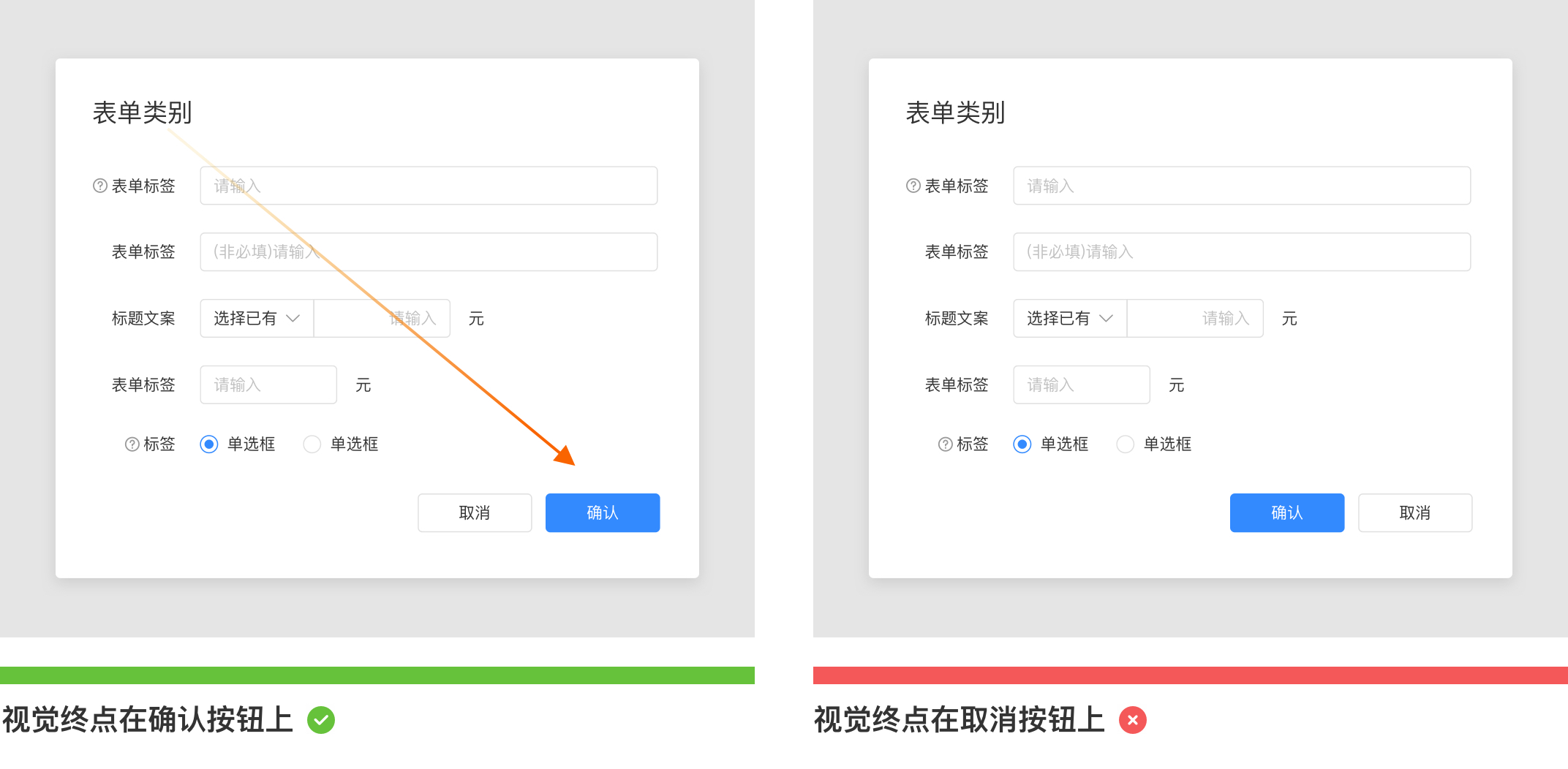 如下圖是一個(gè)彈窗類型的表單,如果根據(jù)業(yè)務(wù)訴求確認(rèn)操作重要程度強(qiáng)于取消操作,那么確認(rèn)按鈕應(yīng)該放在取消按鈕的右邊。因?yàn)榇_認(rèn)按鈕放在右側(cè)(終點(diǎn)區(qū)) 用戶關(guān)注度會更強(qiáng)。