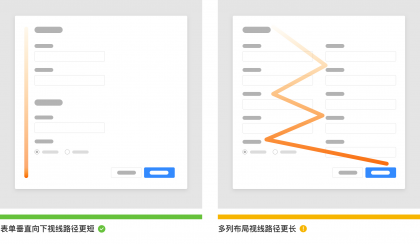 多列表單字段會導(dǎo)致用戶視覺路徑變長,因?yàn)槿绻韱沃杏兴较噜彽淖侄危瑒t用戶必須以Z樣式進(jìn)行視線掃描,整體的效率和工作量都更大,使清晰的路徑變得模糊并加長用戶閱讀時(shí)間。多列表單可能會存在用戶跳過他們實(shí)際要輸入的必填字段,將數(shù)據(jù)輸入到錯(cuò)誤字段中。而最終校驗(yàn)信息時(shí)用戶得反復(fù)檢查錯(cuò)誤項(xiàng)導(dǎo)致用戶放棄填寫。