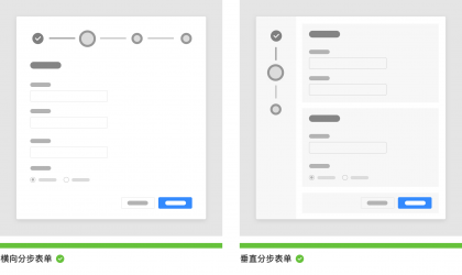 較為復(fù)雜的一類表單,把一個(gè)相對復(fù)雜的表單字段拆解為多個(gè)步驟進(jìn)行。根據(jù)業(yè)務(wù)屬性進(jìn)行步驟分組利用步驟條告訴用戶所完成的流程和進(jìn)度,當(dāng)用戶每次填寫都意味著一次節(jié)點(diǎn)完成,整個(gè)流程結(jié)束給予明確的結(jié)果反饋,并以提交成功為最終。分布表單有利于減輕用戶由于表單大而復(fù)雜的造成的填寫負(fù)擔(dān),并且能減少用戶表單填寫出錯(cuò)率。