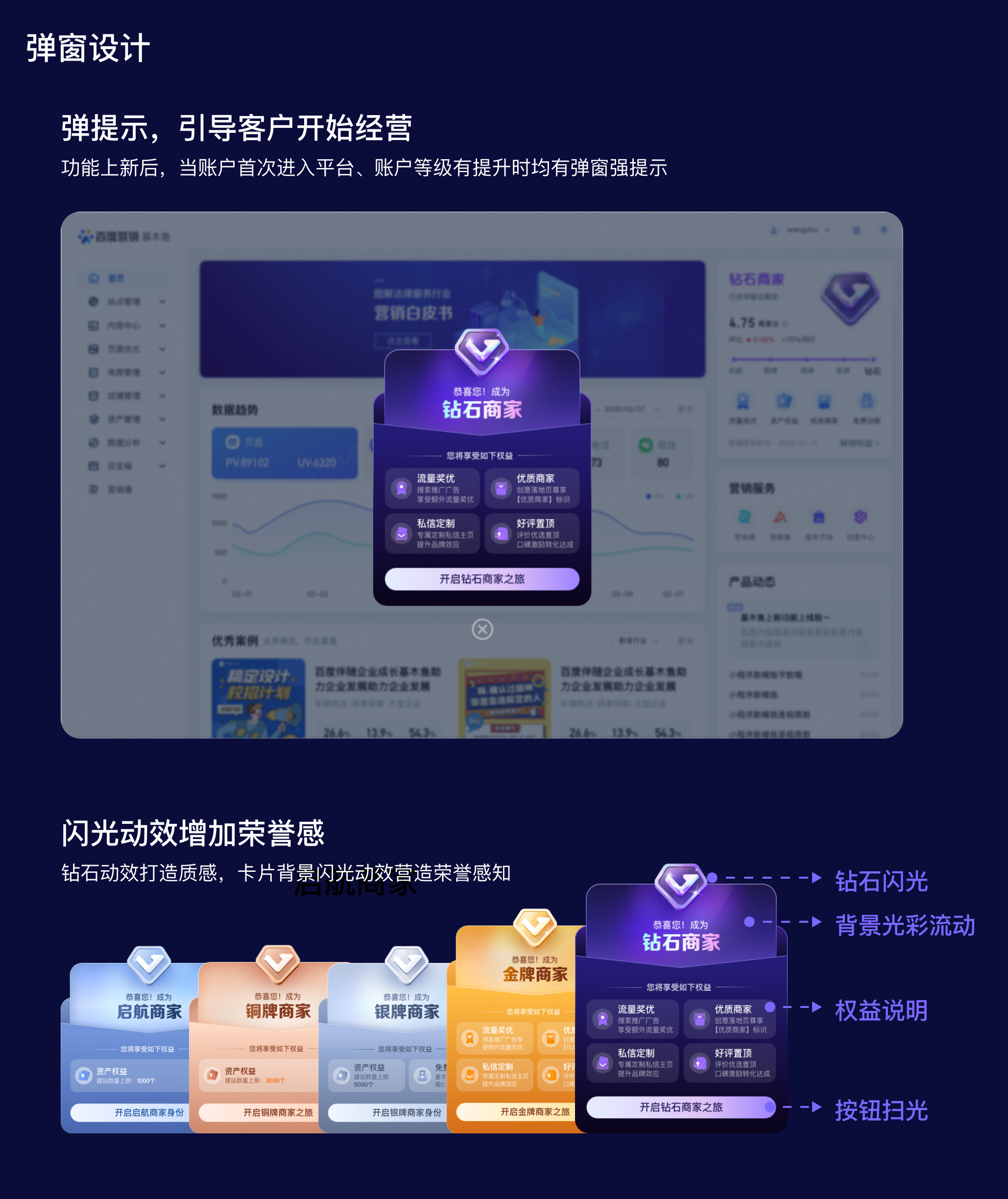 彈窗:作為常見的通知容器,常用于向用戶提供重要的通知、更新、提醒或行動建議。在此項目中,為了增強商家的感知,我們選擇2個場景以彈窗的形式給予商家強提示,一是在功能上線后以彈窗的形式顯示對應等級的信息,以吸引商家的注意力并傳達商家等級的關鍵信息,可以增加商家的感知并引導他們進入商家等級開始經營;二是當商家的等級提升時使用彈窗通知,激勵商家持續經營。