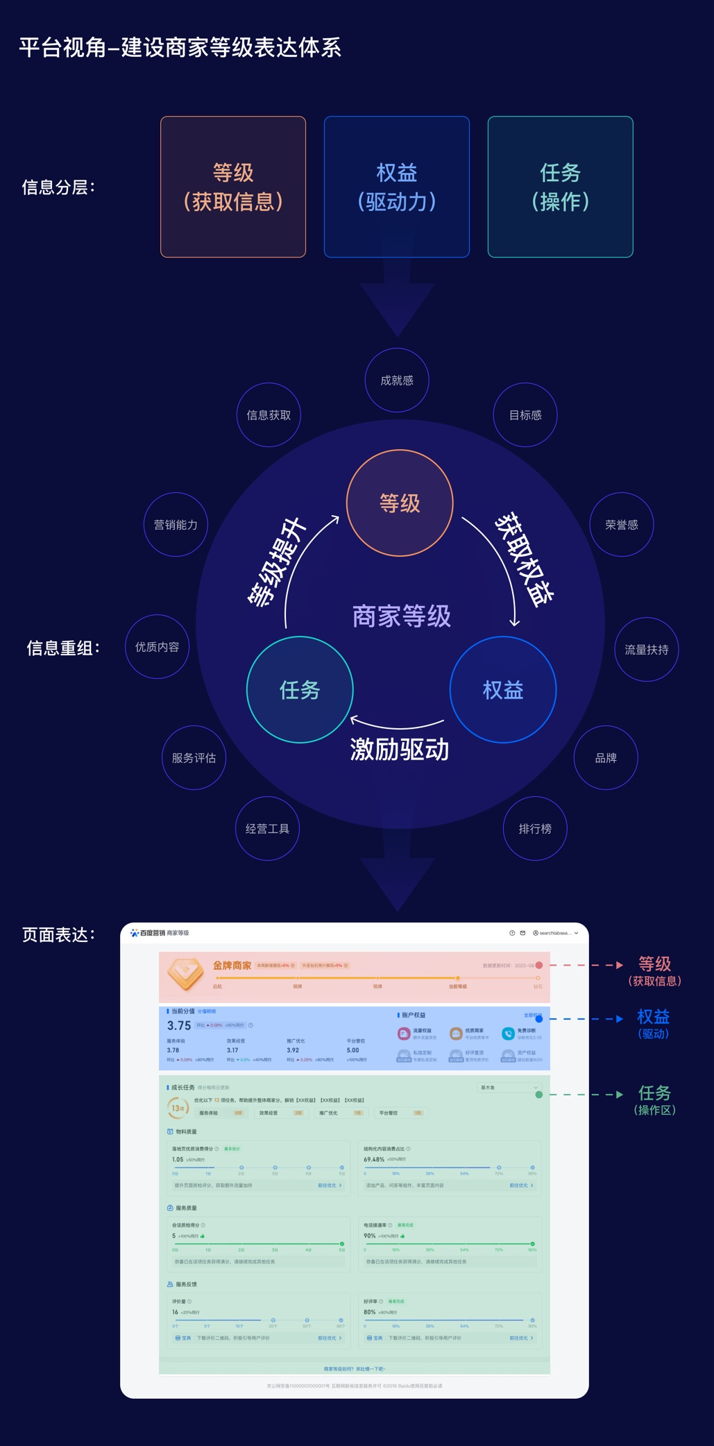 信息分層:開始頁面設計之前需要設計信息結構和組織方式,以便商家可以輕松找到需要的信息。以商家等級為例,首先根據信息價值將信息分為<等級-權益-任務>三大類(等級作銜接、權益提供驅動力、任務是需完成的動作)。