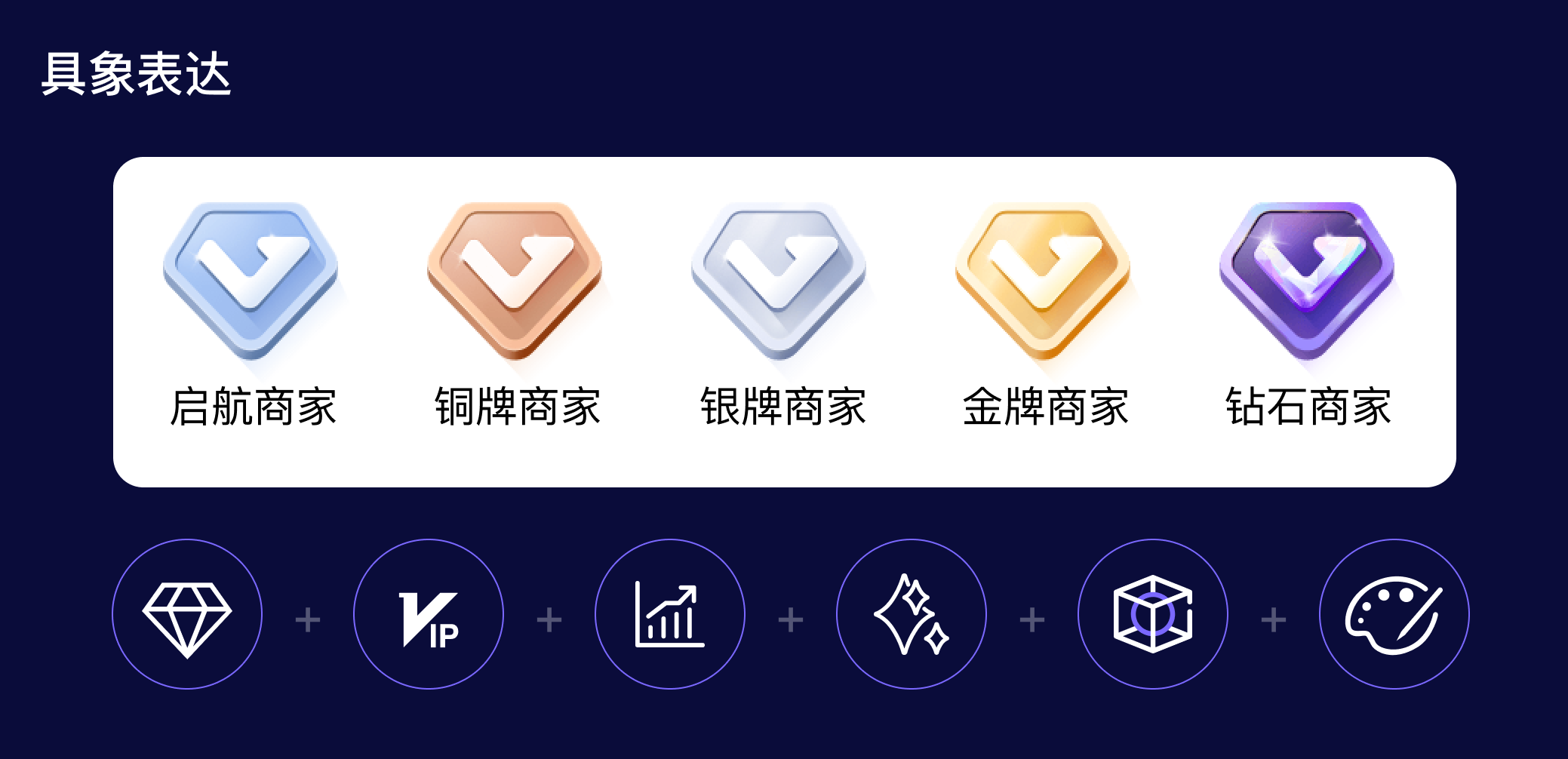 具象表達:有了設計關鍵詞,通過頭腦風暴獲取了一些可以體現這些關鍵詞的具體事物:鉆石、VIP、箭頭、Blingbling、3D、金銀銅等,希望通過具象的事物表達抽象的情緒詞,于是我們從「鉆石」開始入手,把鉆石和VIP、箭頭不斷結合,同時融入BlingBling,金銀銅色等具有普遍認知的元素,用偽3D效果來增加徽標的立體感,最終打造一種獎牌的形態,給客戶帶來更多榮譽感知,突出商家等級的重要性。
