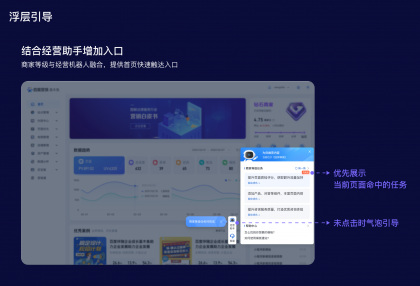 浮層:將操作入口前置披露,提升商家感知同時還可以縮短操作步長。在商家等級項目里,衡量商家主動經營的標準是做任務,所以任務入口的前置披露是提升主動經營的關鍵舉措。于是,圍繞商家等級包裝了“經營助手”的概念,幫助平臺給商家推薦一些成長任務和優化建議,并在平臺首頁主動彈出,以此提高任務觸達率。但使用這種主動觸達手段時,需要考慮對商家的打擾和阻斷情況,所以需要對主動彈出的頻率作限制,然后配合氣泡和標簽等視效元素吸引商家視線。這樣可以引導商家參與商家等級完成任務,促進其成長和等級提升。