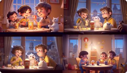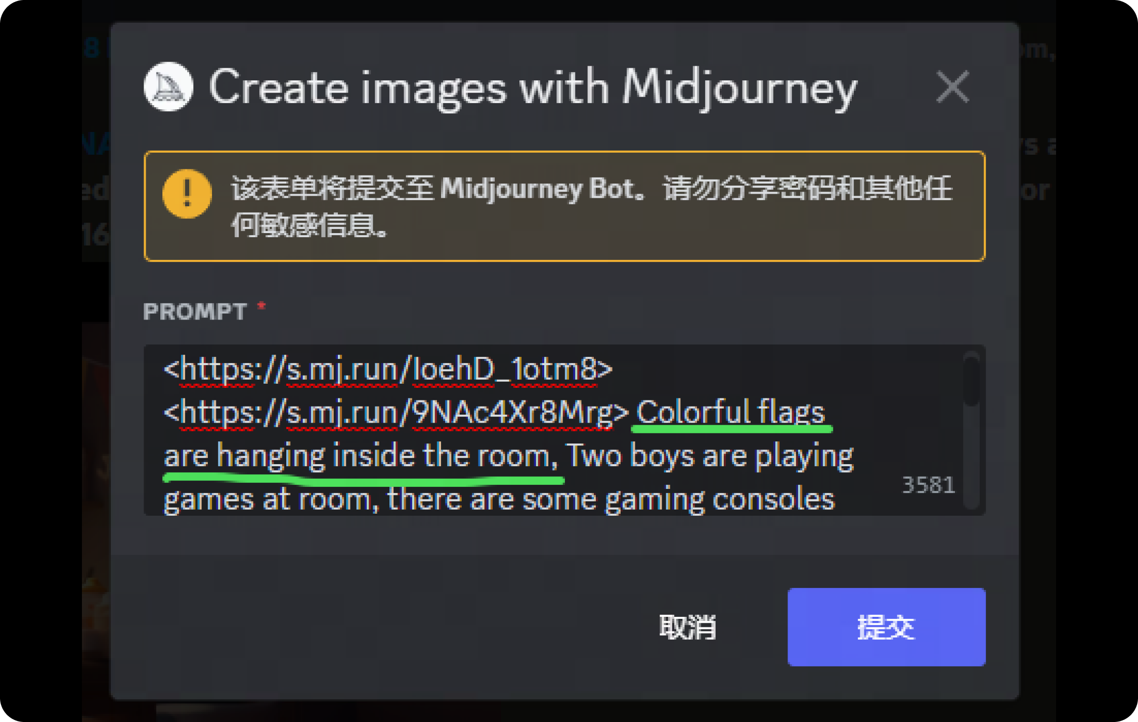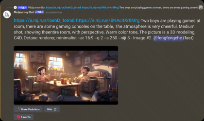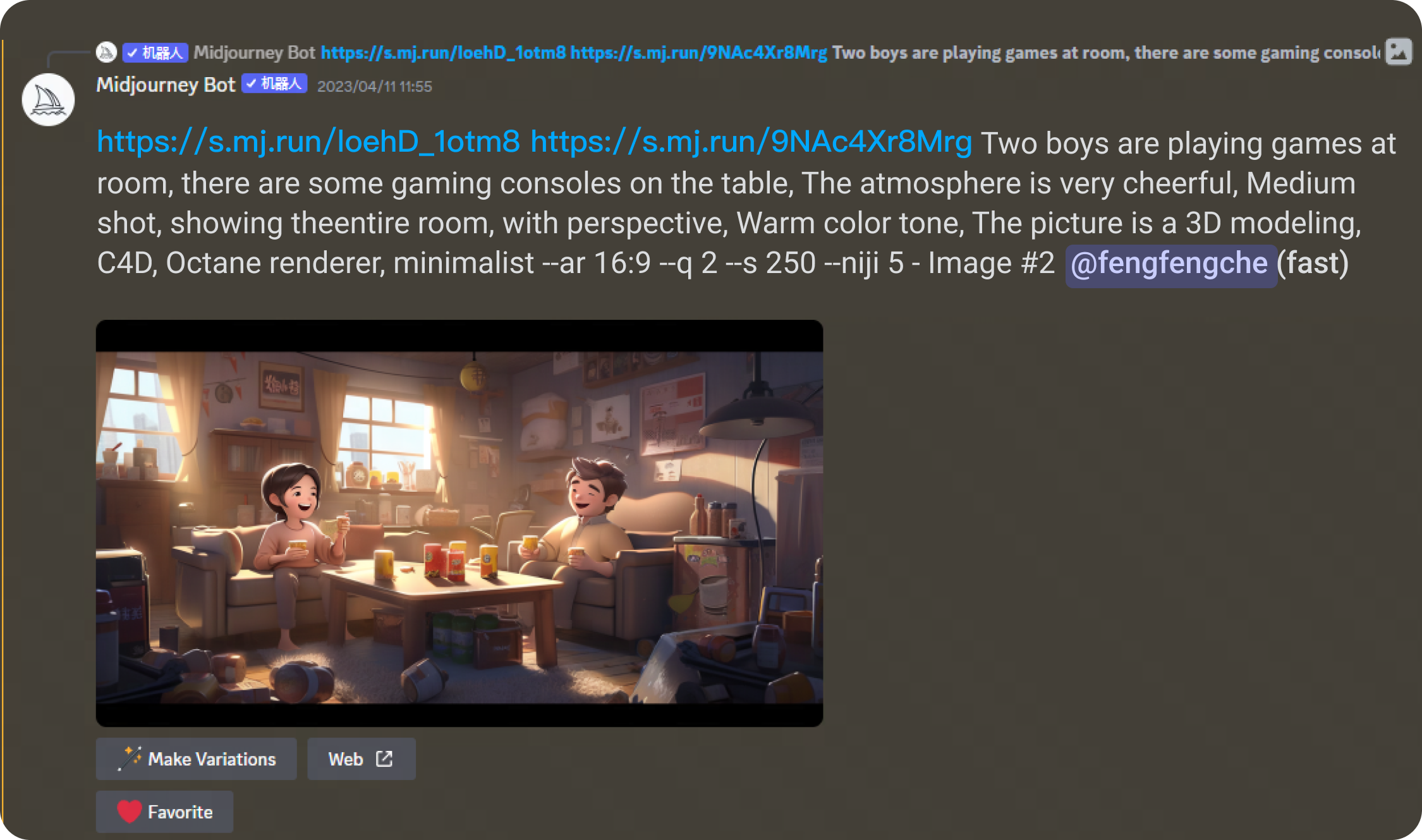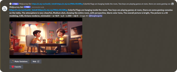 得到這張圖后,覺得畫面左上角部分有些空白,為了襯托歡快聚會的氛圍,我們決定在左上方加上掛旗。方法也是運(yùn)用Midjourney的混音模式。在關(guān)鍵詞中加入“屋子里掛著彩旗”。