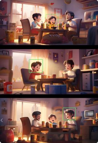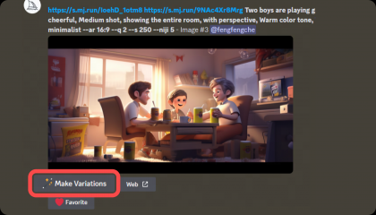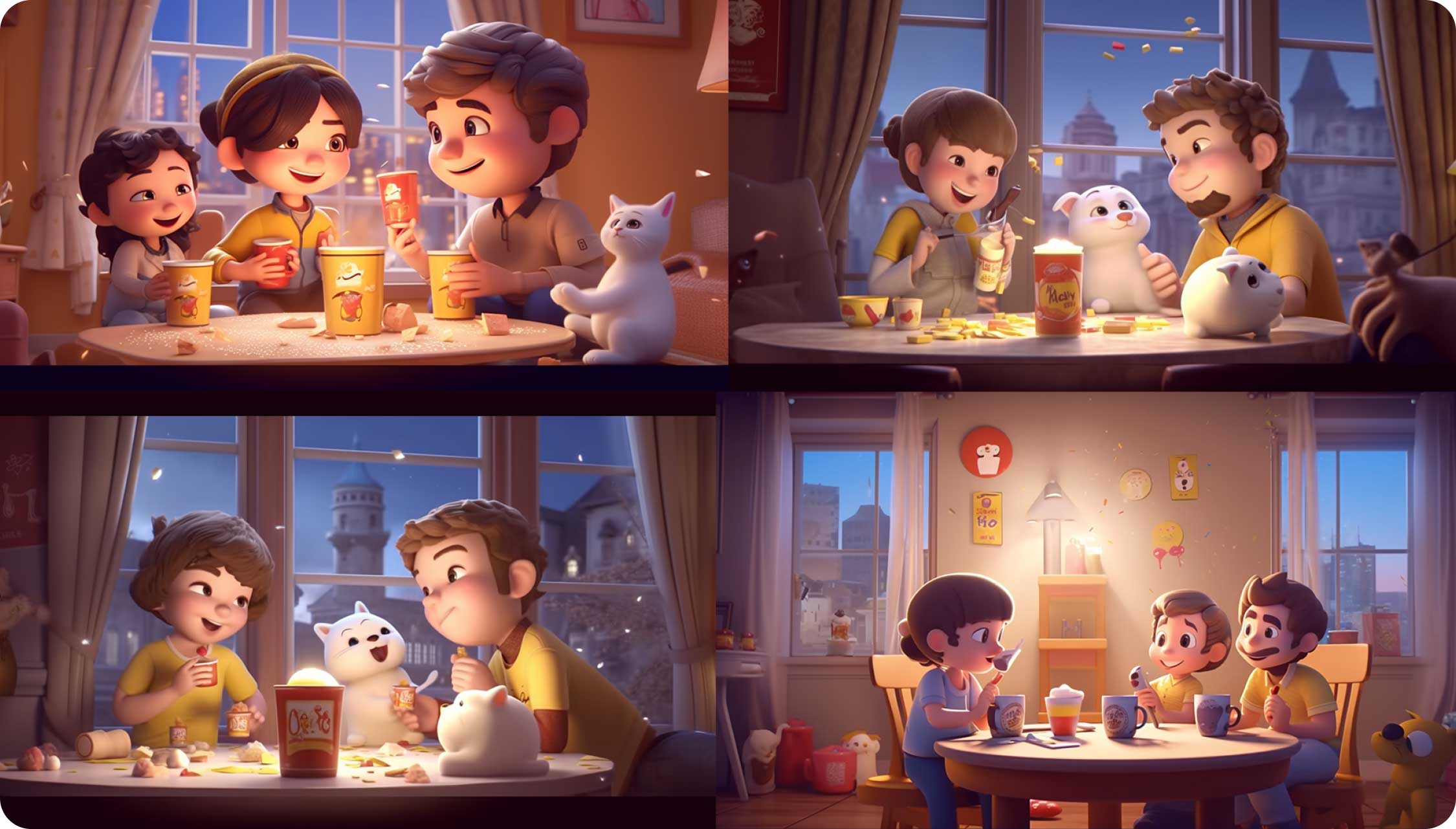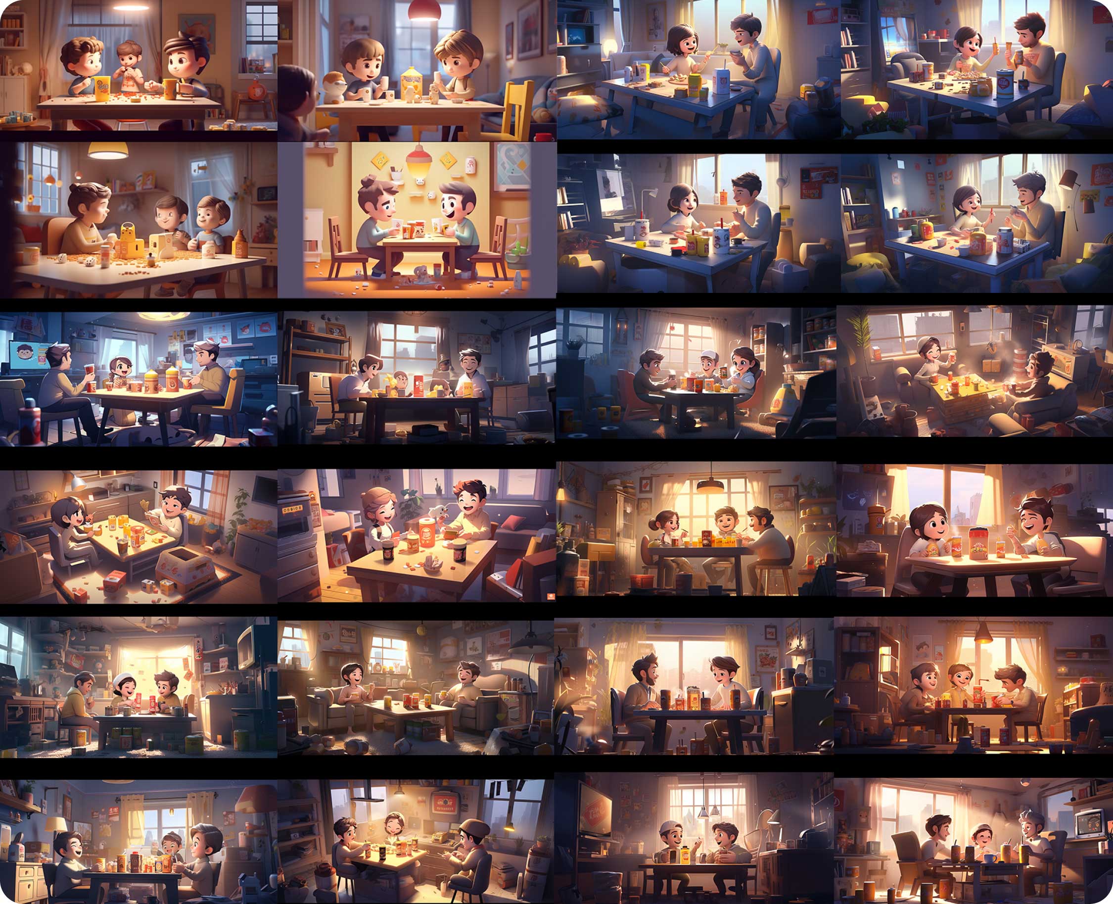 在前期,我們對構(gòu)想的畫面進(jìn)行關(guān)鍵詞的描述:“可愛帥氣的男女孩子們一起玩手機(jī),開心地微笑著,舉起手歡呼,溫暖的房間,大型落地窗。”將關(guān)鍵詞翻譯后放入Midjourney中進(jìn)行煉圖,最終篩選了幾張氛圍還不錯(cuò)的進(jìn)行下一步操作。