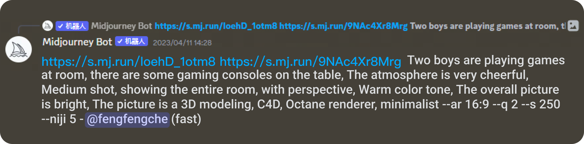緊接著我們用之前篩選出來的其中一張或多張圖片,在Midjourney中進(jìn)行墊圖,根據(jù)之前所得結(jié)論對關(guān)鍵詞進(jìn)行優(yōu)化,再開始新的一輪煉圖。(關(guān)鍵詞增加了“中景”、“展示整個(gè)房間”、“透視感”、“畫面明亮”。)