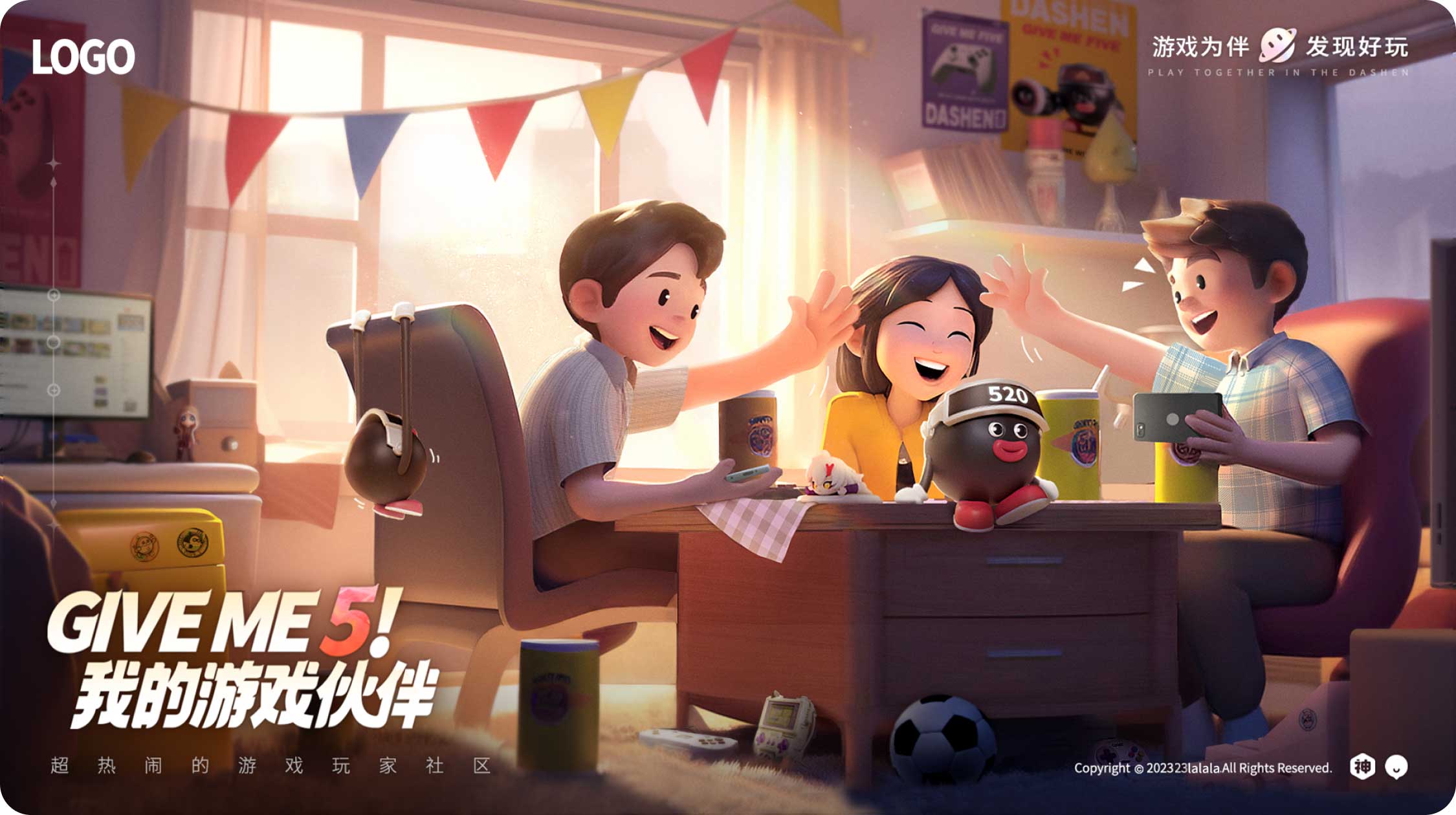 需求方希望畫面能展現(xiàn)出品牌的社交感,以“游戲伙伴”為主題,畫面表達(dá)各種不同類型游戲伙伴,因我們的產(chǎn)品而相聚的場景。同時(shí)希望畫面中的人物能做出擊掌(GIVE ME 5)的動作,以此呼應(yīng)品牌發(fā)布會的主題。
