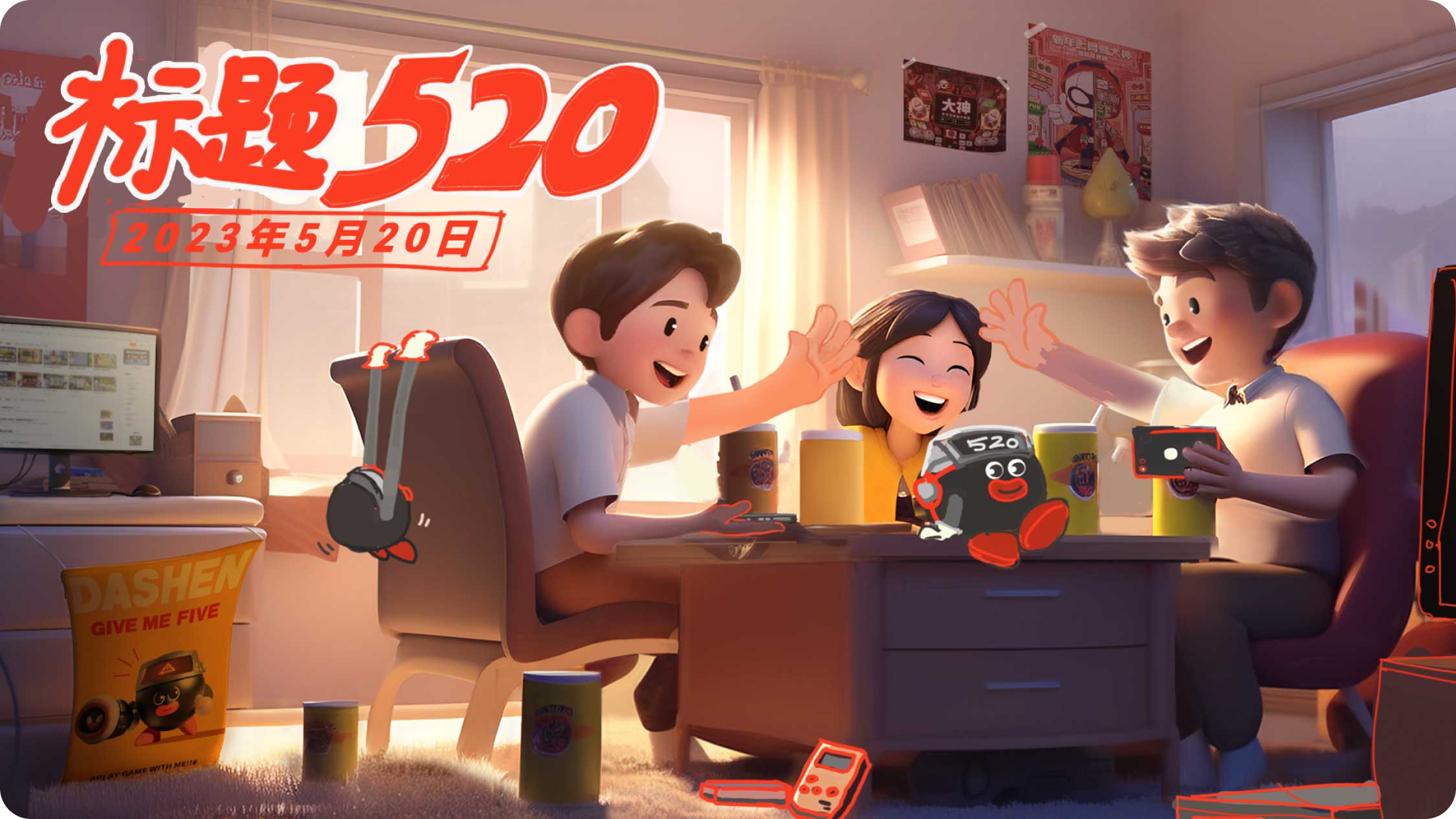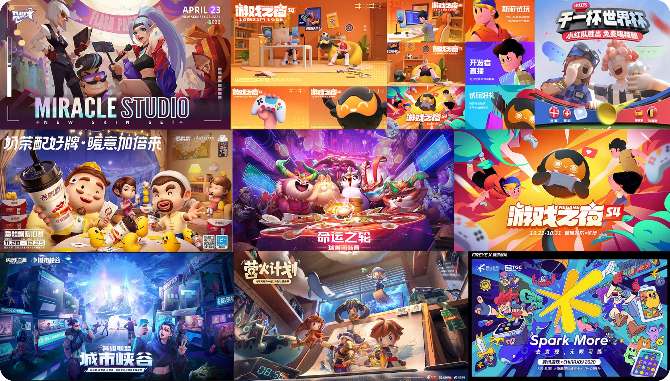 大概描繪了幾個(gè)伙伴在組隊(duì)玩游戲,因?yàn)楂@得了勝利相互擊掌(give me 5)的輕松愉快的畫面。周圍有一些和游戲相關(guān)的元素,IP形象也在畫面中心露出,強(qiáng)調(diào)與品牌之間的關(guān)系。