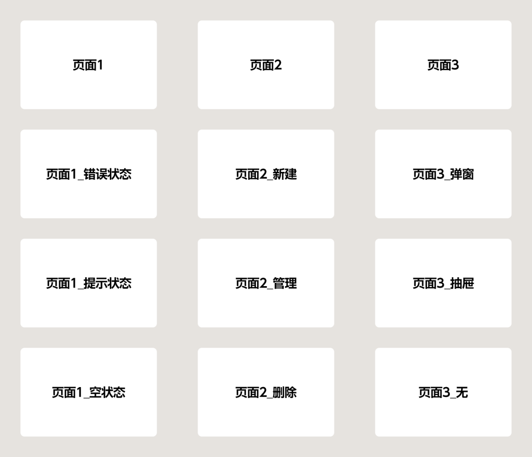 排列頁面時,也需要具有一定的邏輯,橫向一般表示不同的頁面,縱向表示同一個頁面的事件和狀態。并且橫豎間距盡量保持統一,建議左右不低于 800px,上下不低于200px 的間隔,這樣即不影響后續添加說明,也不影響前端查看頁面時被其它頁面干擾。