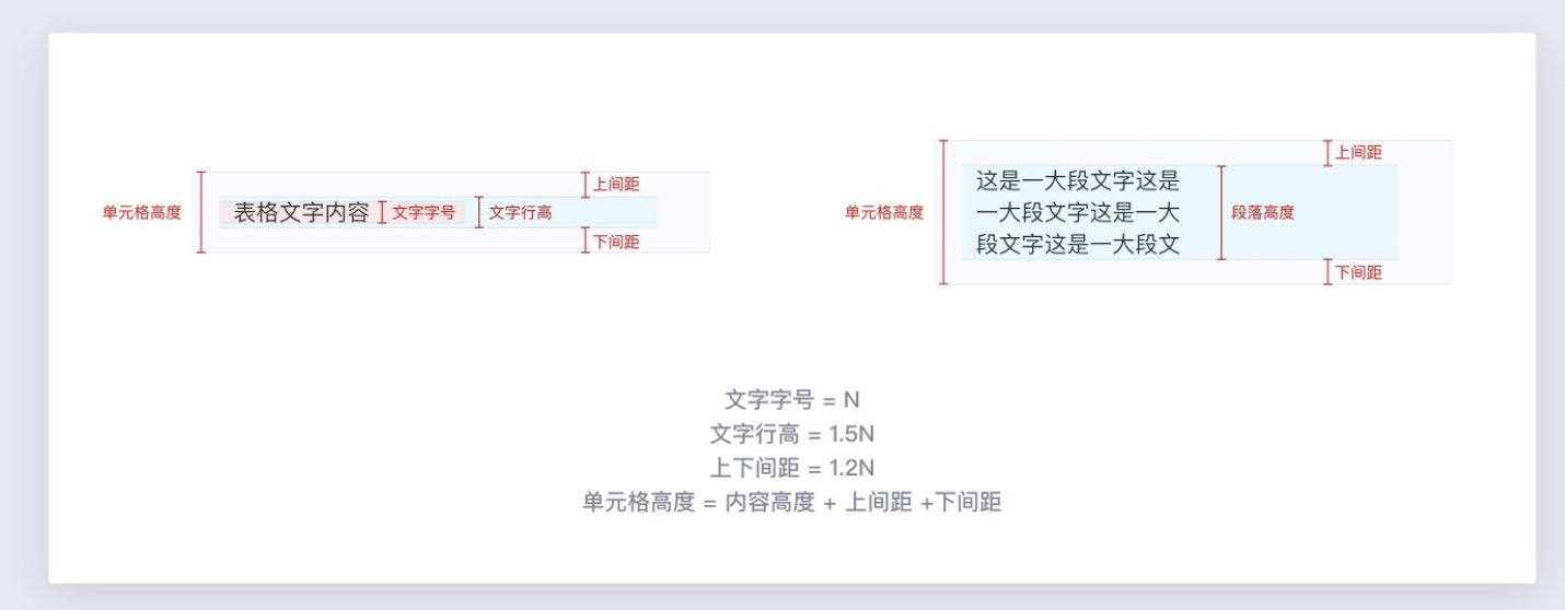 在開發(fā)同學(xué)的眼中,單元格高度=內(nèi)容高度+上間距+下間距,在實(shí)現(xiàn)設(shè)計(jì)稿時(shí),通常也是按照這個(gè)方式來寫的,而不是像設(shè)計(jì)同學(xué)一樣按照文字的尺寸來計(jì)算間距。其中,文字行高建議設(shè)為字號(hào)的1.5倍,上下間距設(shè)為字號(hào)的1.2倍。