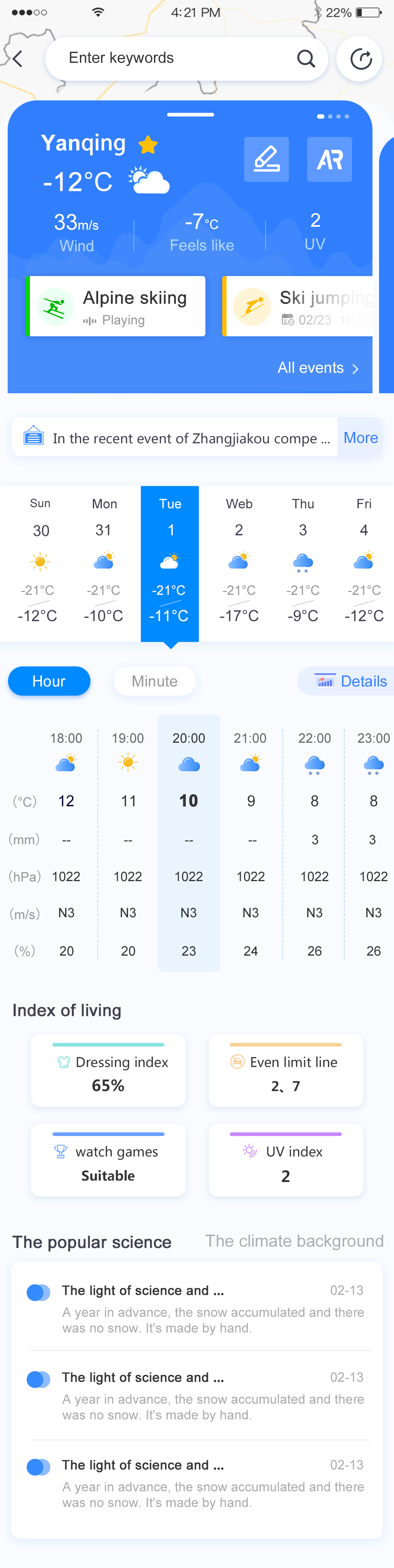 實況模塊,當用戶在京津冀地區時,進入主頁便會顯示當前位置的的實況信息,當用戶不在時便會顯示為“北京賽區”的實況信息。點擊地點名稱旁邊的小箭頭,可以切換到其它賽區或者站點的實況天氣。實時信息往上滑動便可以查看更多的氣象要素信息,如下圖。