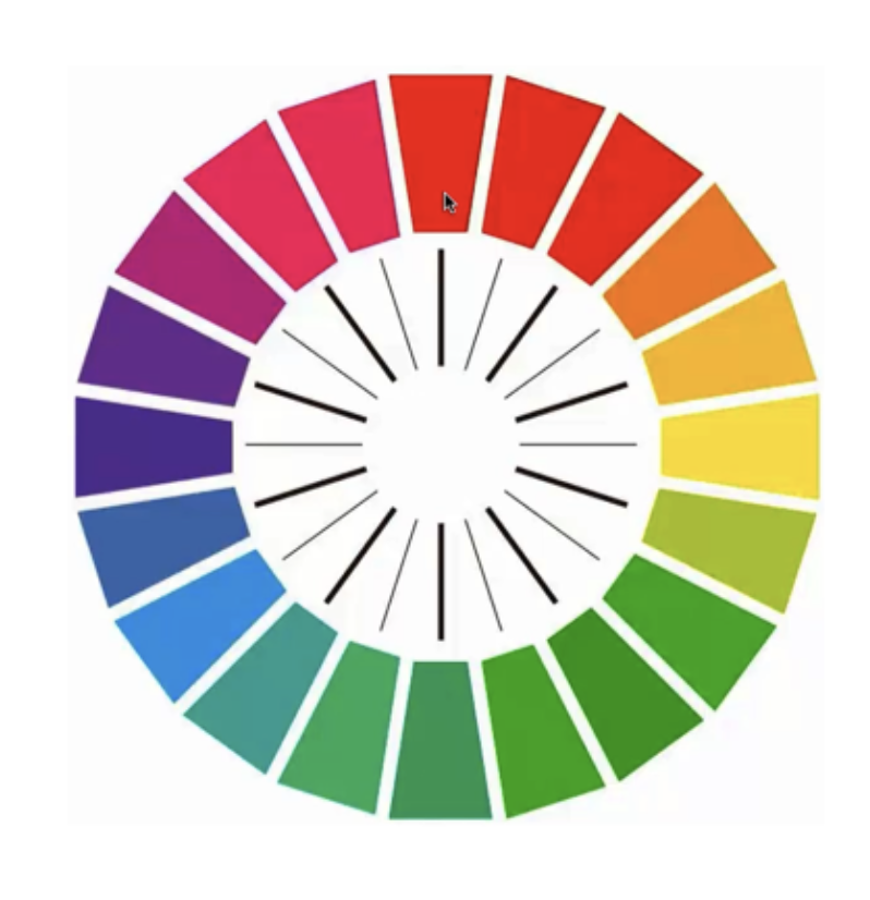 • 光譜順序:紅、橙紅、黃橙、黃、黃綠、綠、綠藍、藍、藍紫、紫、紫紅,十二色相環每色相距 30 度,二十四色相環每色相距 15 度。