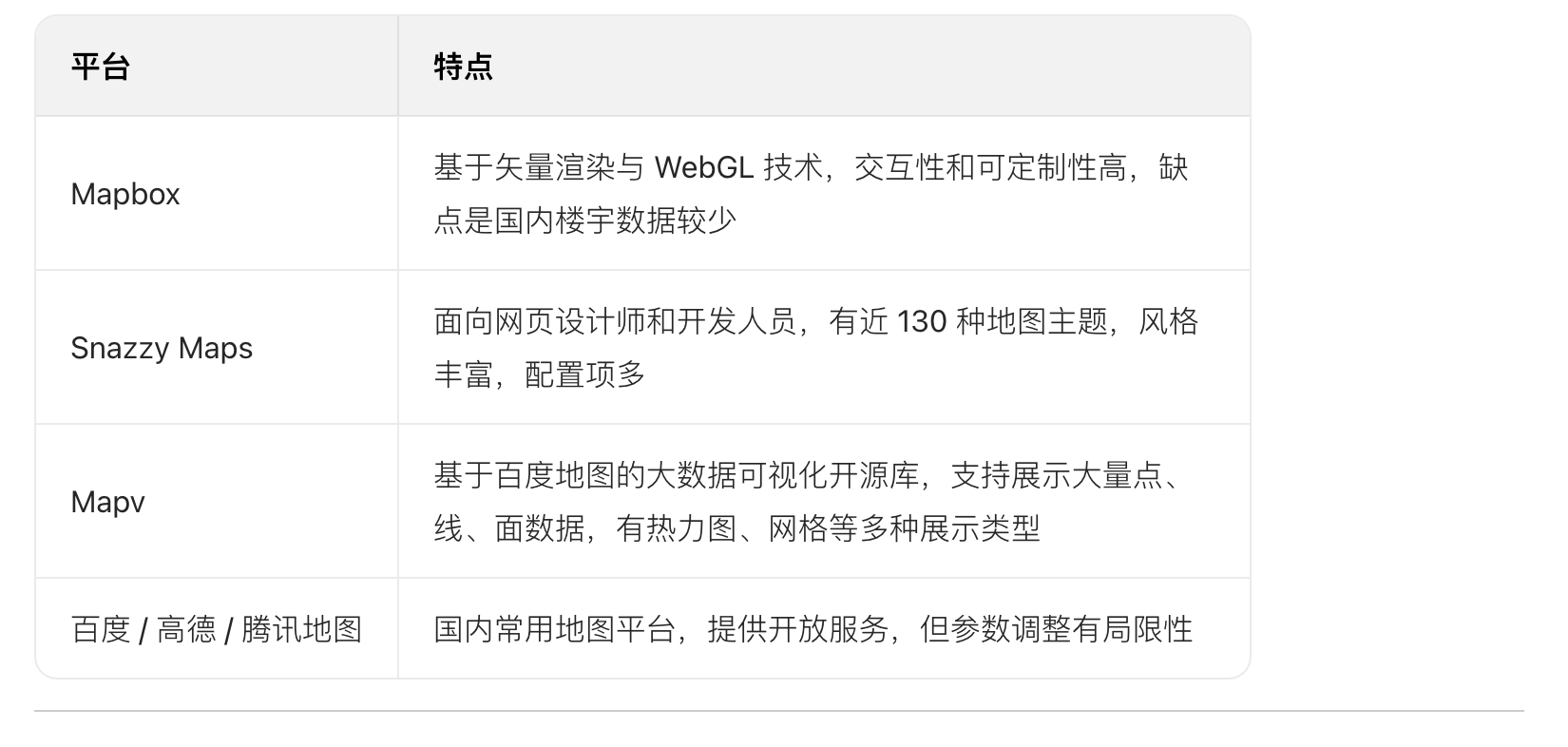 - 技術能力:可制作 2D、3D 矢量、邊界、瓦片地圖,支持交互、漫游(如點擊下鉆到區縣),可添加飛線層、氣泡層、熱力層等多層數據并設置不同效果。