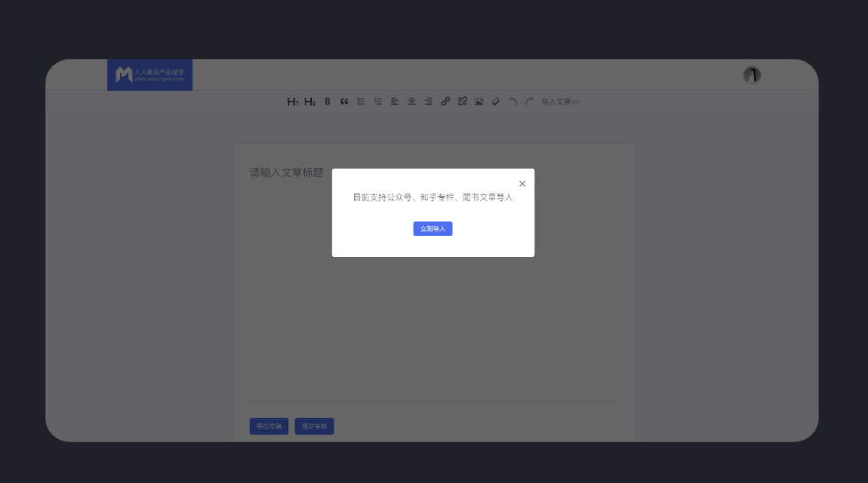 好用的 B 端產品能顯著提升用戶操作效率,讓工作如行云流水般順暢。反之,難用的產品就像用鈍刀切黃油,不僅效率低下,還會讓人心情煩躁。“人人都是產品經理” 的文章投稿發布頁面設置了文章導入功能,支持從公眾號、簡書、知乎專欄導入文章,大大節省了投稿人編輯文本和排版的時間,減少了重復排版的麻煩,也提高了人們的投稿意愿。