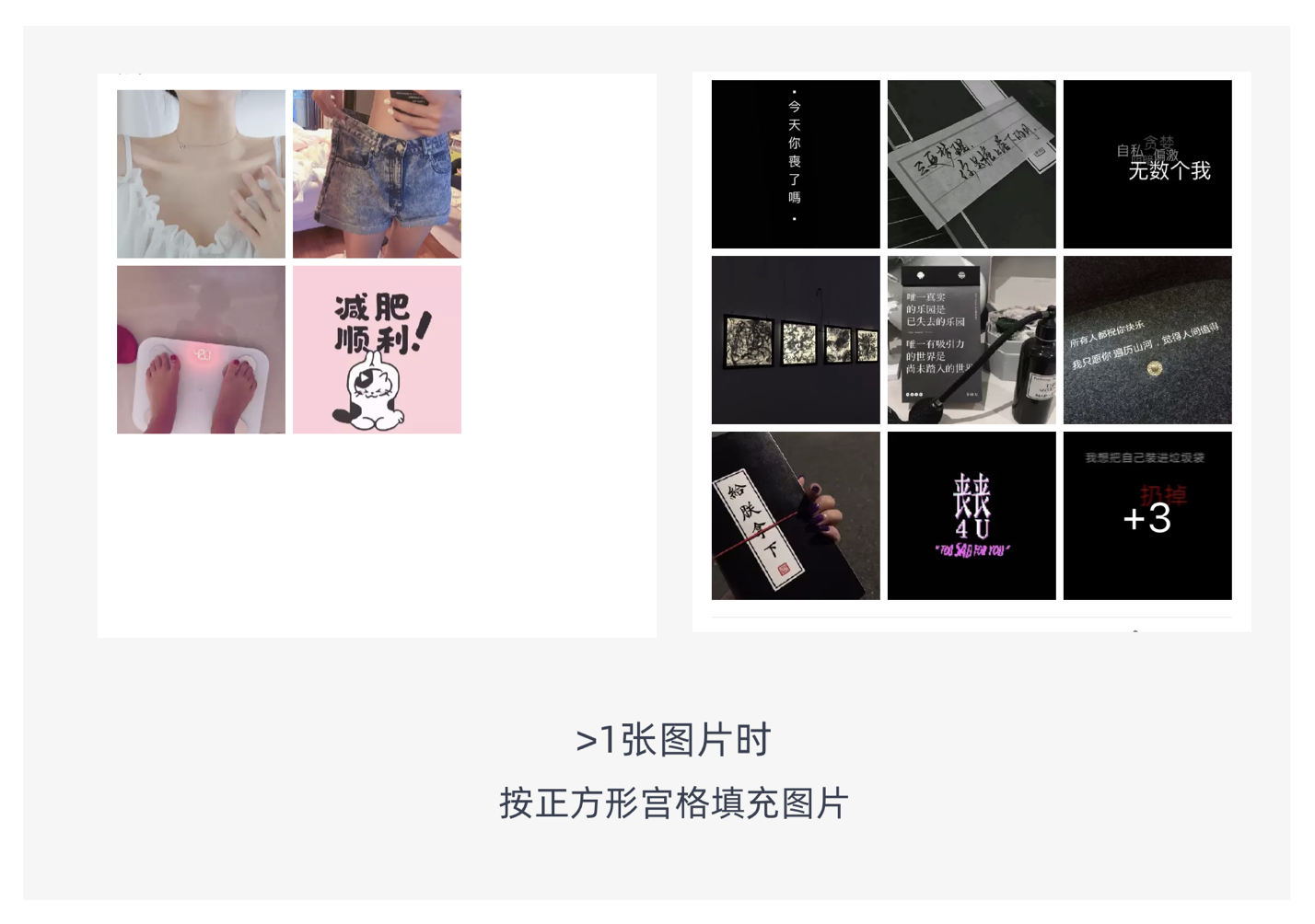 宮格式布局是指用戶上傳的圖片會適配到一個(gè)個(gè)的方格中,常見的排版有 3 宮格、6 宮格、9 宮格。它多應(yīng)用在社交類的 APP 中或者電商 APP 的內(nèi)容社區(qū),如微博、微信、QQ 空間等社交 APP,以及淘寶等電商應(yīng)用的內(nèi)容社區(qū)。