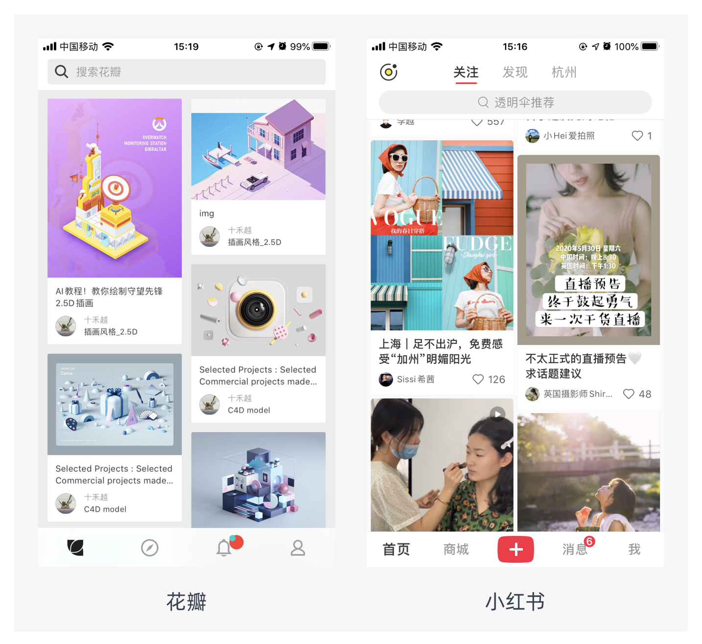 瀑布流式布局的視覺表現(xiàn)為參差不齊的多欄布局,用戶的視線軌跡以 Z 型為主,這種軌跡易于閱讀。但由于用戶采用 “就近原則” 閱讀信息,容易產(chǎn)生漏讀現(xiàn)象。它適用于社區(qū)類瀏覽型頁面,這類頁面往往信息量大,采用瀑布流式布局能讓瀏覽體驗(yàn)更為流暢,如花瓣、小紅書等平臺,用戶可以不斷下拉獲取更多內(nèi)容,沉浸在瀏覽過程中。