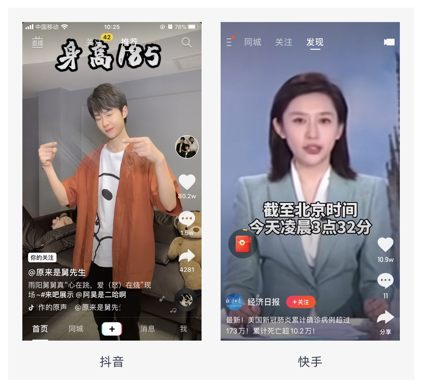 視頻性 Feed 流以短視頻為主(長視頻占用用戶時(shí)間長,容易導(dǎo)致用戶缺乏耐心),搭配輔助文字。它的優(yōu)點(diǎn)是能滿足用戶在視覺和聽覺上的感受,沉浸式體驗(yàn)好,更加容易吸引用戶的注意力,一般情況下會主動且循環(huán)播放,畫面占滿全屏,如快手、抖音、微視等。不過,它也存在缺點(diǎn),占用空間大,展示內(nèi)容少,而且需要緩存,對網(wǎng)絡(luò)質(zhì)量要求高。