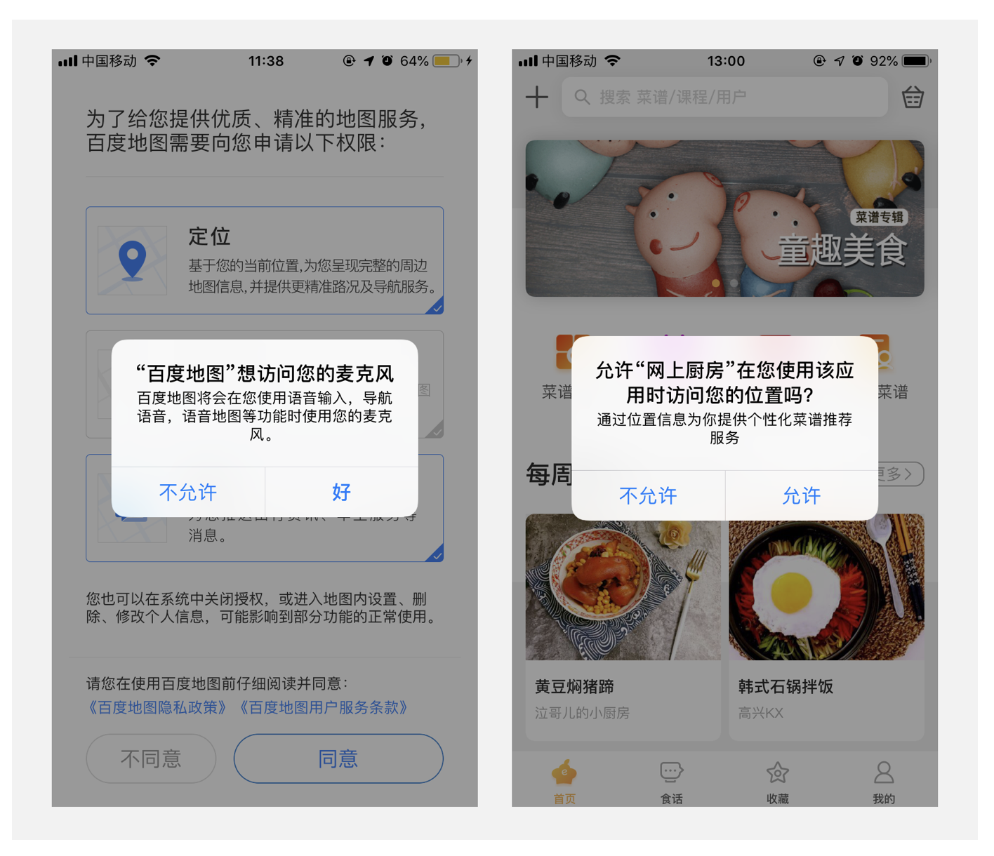 - 系統(tǒng)功能的授權(quán):如 “百度地圖” 申請(qǐng)?jiān)L問(wèn)麥克風(fēng)、“網(wǎng)上廚房” 申請(qǐng)?jiān)L問(wèn)位置的彈窗,這類屬于系統(tǒng)自帶的授權(quán)彈窗,在許多 APP 中都較為常見(jiàn)。