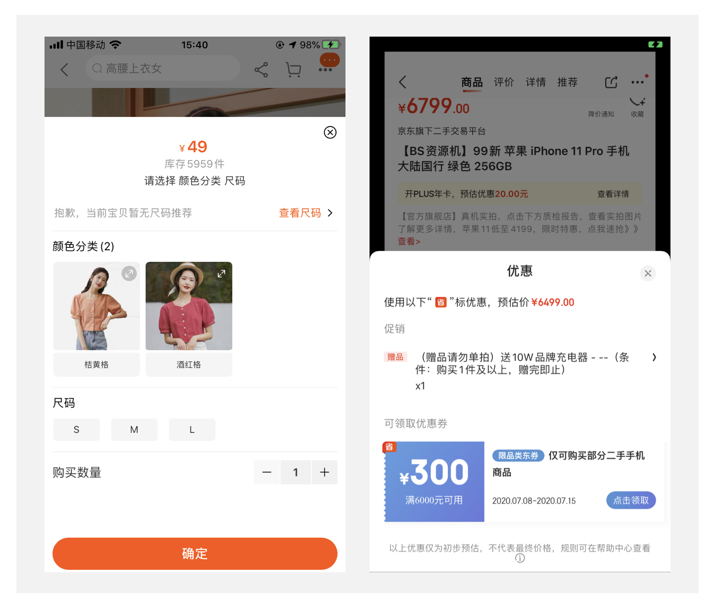- 半屏彈窗:淘寶和京東的購(gòu)買頁(yè)面彈窗是比較典型的例子,在各種電商產(chǎn)品中應(yīng)用廣泛,方便用戶選擇商品規(guī)格、數(shù)量等。