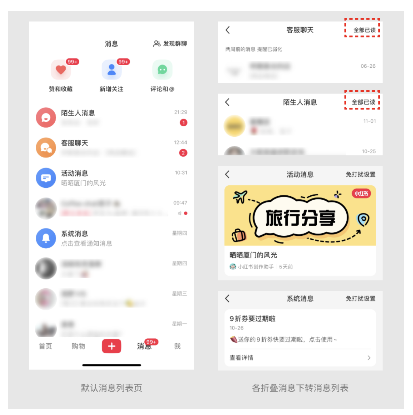 但到了 “客服聊天” 和 “陌生人消息” 里,“全部已讀” 就出現(xiàn)了。客服消息大多是 “訂單咨詢”“售后反饋”,事情解決后就成了沒用的歷史記錄;陌生人消息里可能有營銷騷擾,默認折疊還能避免打擾。我上次在小紅書買衣服,和客服聊完尺碼后,點 “全部已讀” 把對話清掉,消息頁瞬間清爽,也不會誤刪重要的社交消息。