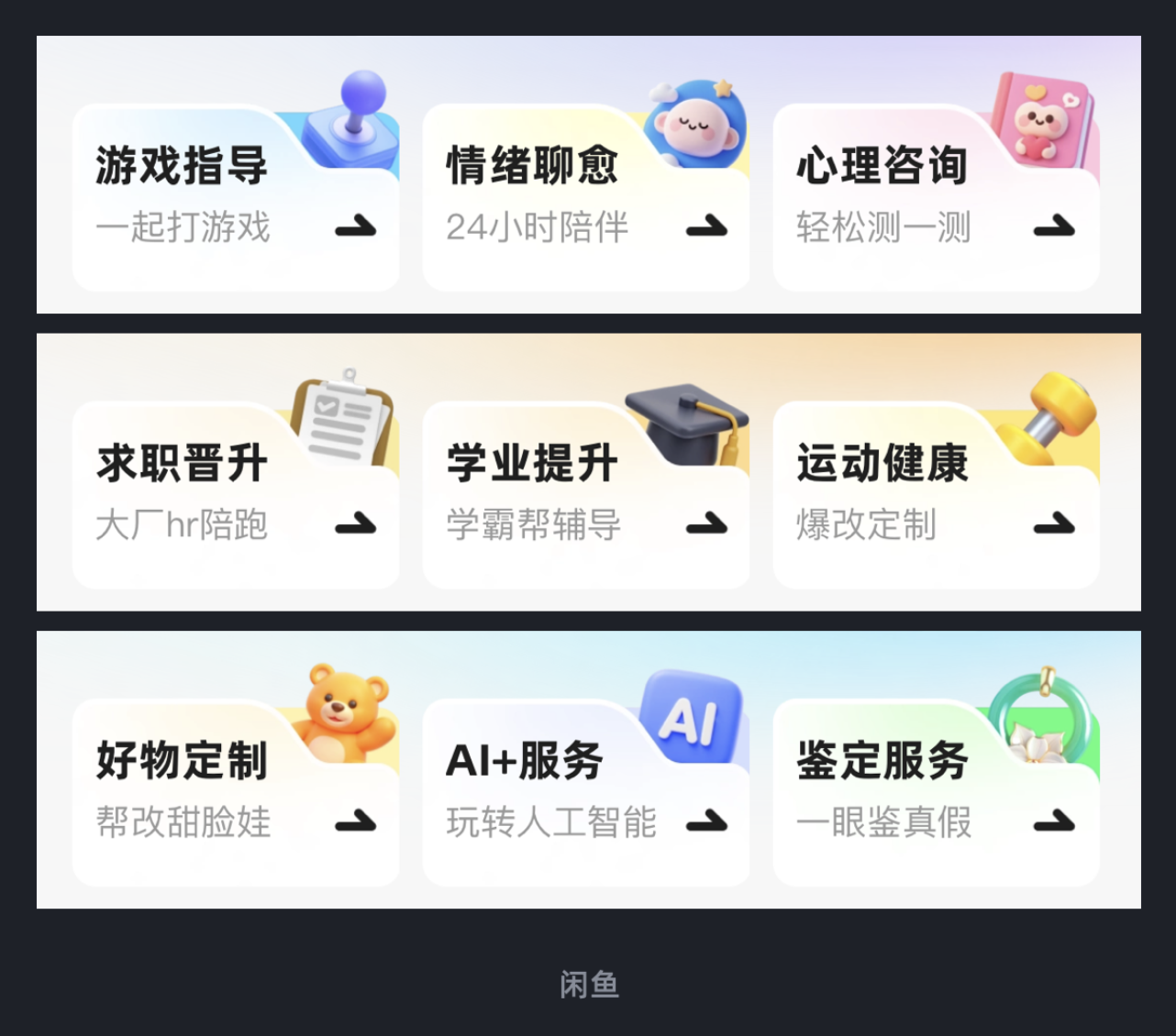 閑魚的副業(yè)模塊(如游戲指導(dǎo)、情緒聊愈、心理咨詢)采用 “異形卡片” 設(shè)計(jì):每張卡片的右上角都做了凹陷處理,將功能圖標(biāo)嵌入凹陷處,形成 “卡片 - 圖標(biāo)” 的第一層關(guān)聯(lián);同時(shí),每張異形卡片下方又疊加了一層淺色調(diào)的背景卡片,通過(guò)色彩深淺和輪廓差異,形成 “背景卡片 - 異形卡片 - 圖標(biāo)” 的三層結(jié)構(gòu)。這種設(shè)計(jì)不僅讓每個(gè)副業(yè)模塊的邊界更清晰,還通過(guò) Z 軸層級(jí)的差異,避免了多模塊排列的呆板感,用戶能快速識(shí)別不同功能。