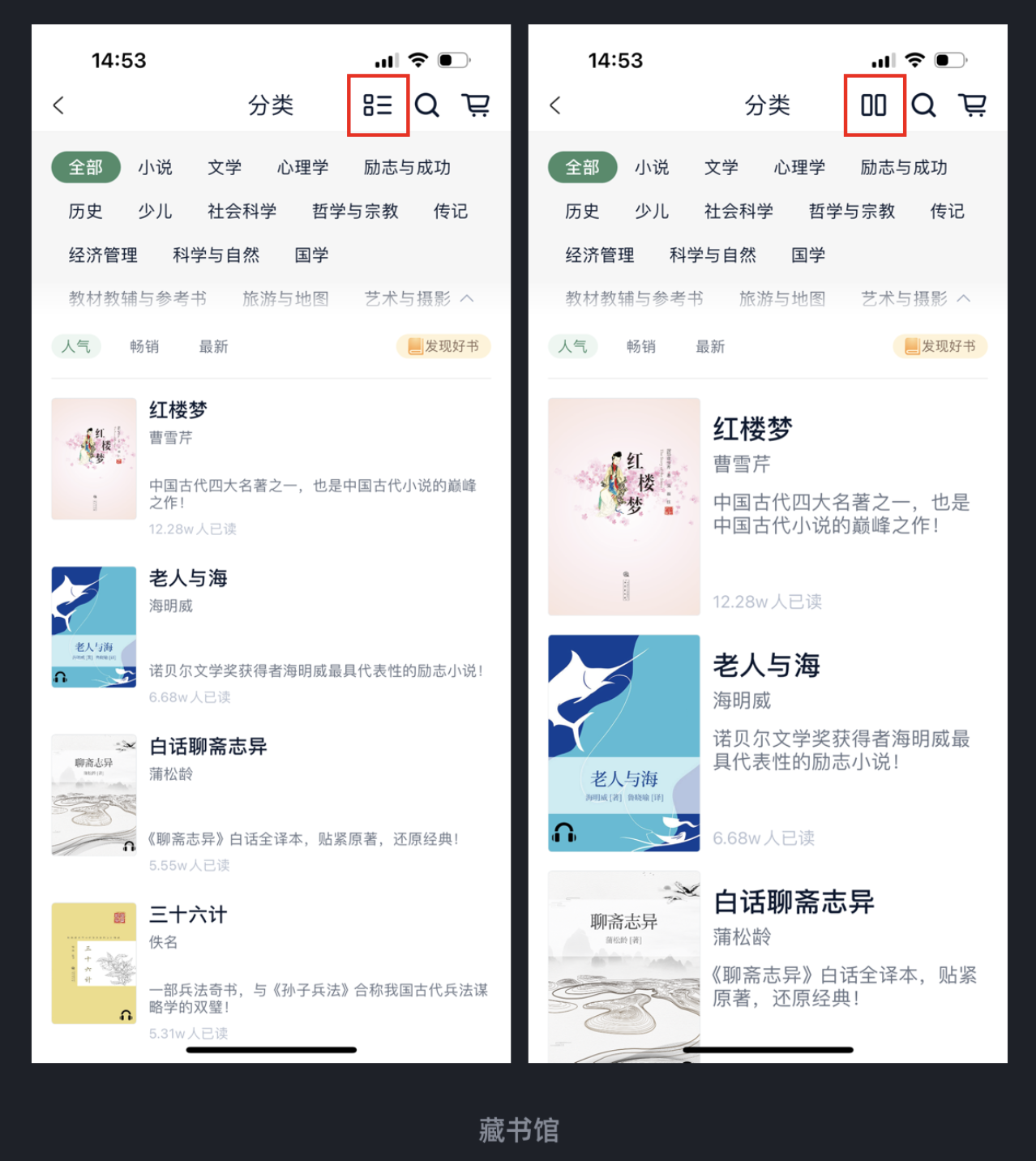 藏書館 APP在 “書庫分類” 模塊里,就做了 “可切換大小” 的布局設計: