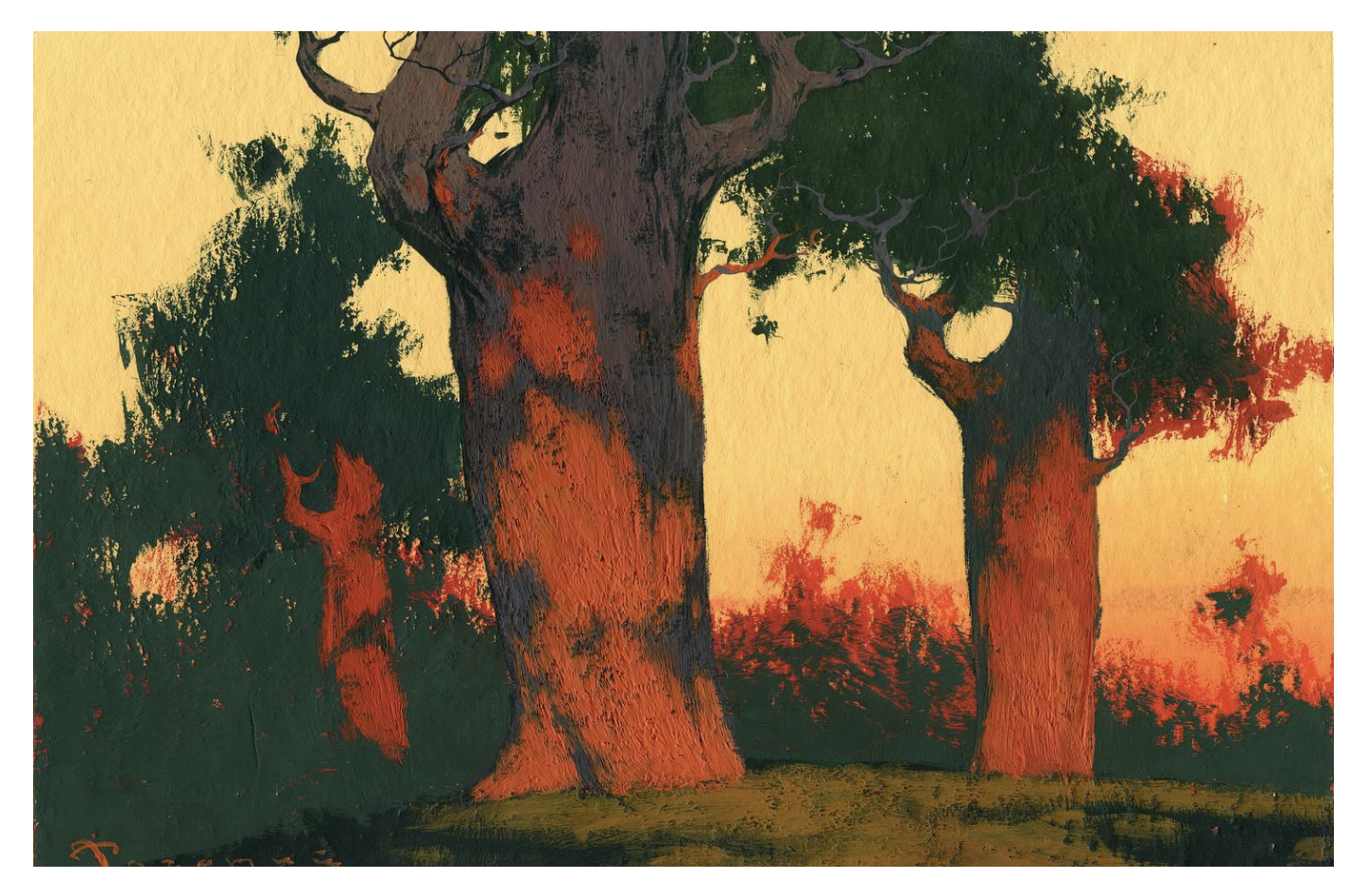 - 配色的矛盾與和諧:藍(lán)紫色的冷、晚霞的暖、枯樹(shù)的褐,這些看似沖突的色彩在他的畫(huà)布上完美融合。這種 “怪異卻合理” 的配色邏輯,讓每一幅作品都自帶辨識(shí)度,既保留了冬日的清冷基調(diào),又注入了浪漫的溫度。