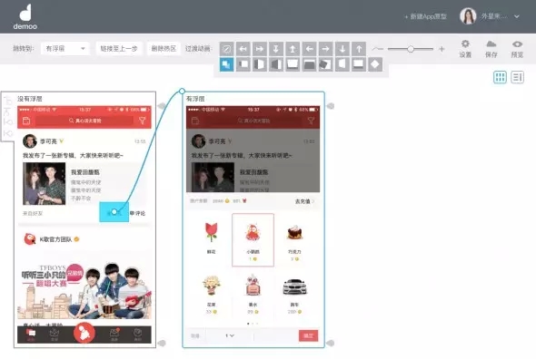 Demoo是基于web設計搭建的一款在瀏覽器內進行可視化操作的工具。通過上傳平面稿件,用手勢或觸點熱區的方式把界面關系連接起來,加入連接轉場,輸出一份仿真APP的、可體驗操作的設計方案,滿足在電腦、會議投影現場及手機上體驗操作。點擊這里可查看更詳細介紹:《為移動端方案設計演示而生的DEMOO》