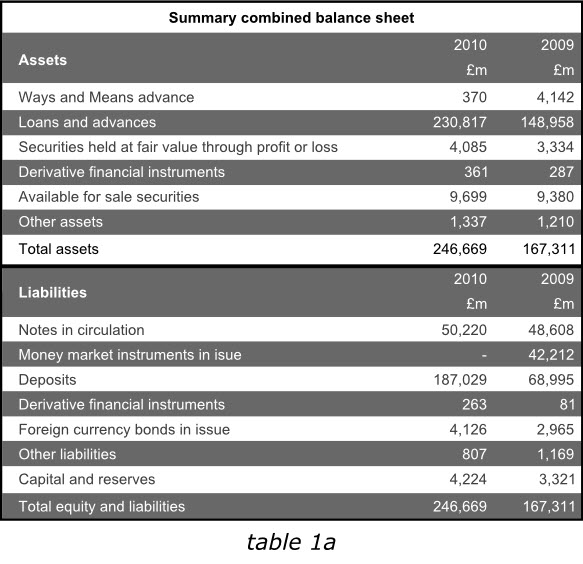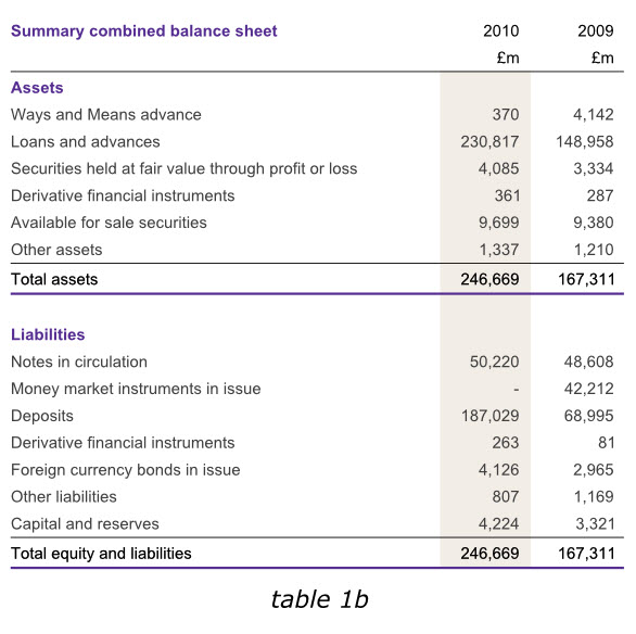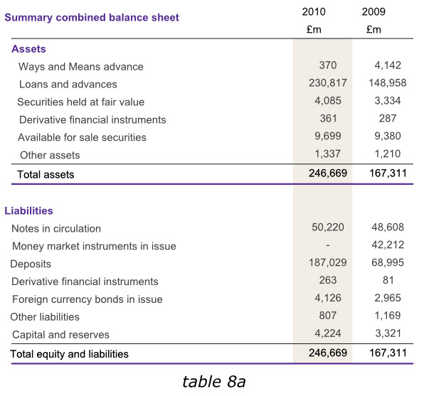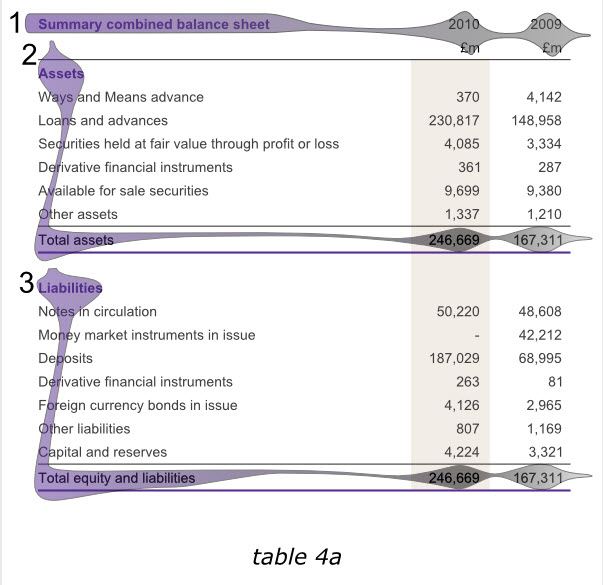 下面的英格蘭銀行2010年年報的一組信息被分成了兩個表格,但仍然體現為一個整體。紫色的表頭清晰的給出了標題,標題行僅用了一次表頭(2009、2010)和單位(英鎊)。兩個表格采用同種顏色加粗的字體作為標題,清晰而相互獨立。兩表各自的最后一行也采用了同樣顏色的下劃線。