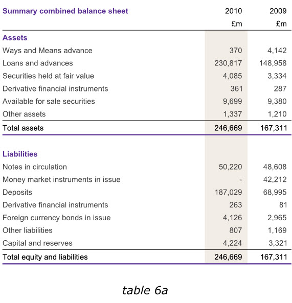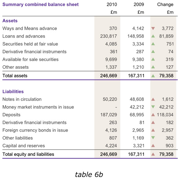 在英格蘭銀行2010年度報告中,盡管我們不能通過改變數據來達到讀者的期望,但是在其他同樣的報告中,我們在末尾增加一列有用的數據,以避免用戶在比較各年度數據的時候,還需要自行計算增長或減少的幅度。下面第一個表格6a已經增加了總資產和總負債數據,而表格6b則在右側增加了新的一列,使我們更容易分析出哪些領域的經營成果發生了實質性變動。