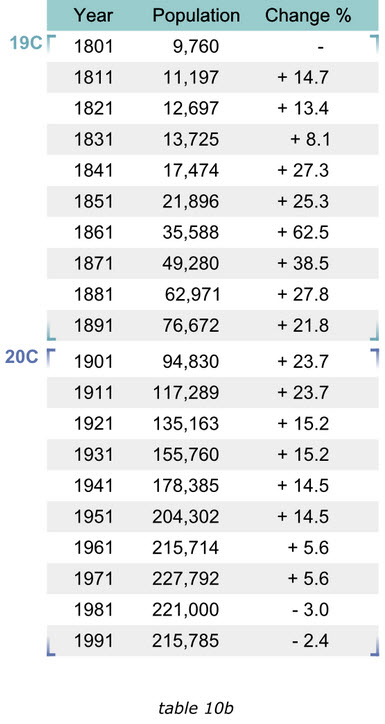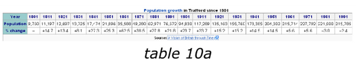 當我們在撰寫wikipedia上的Trafford條目時,有一個1801至1991年的人口變化表格10a,他包含有2行20列,讀者必須記住有關信息,并且不停的對照表頭和數值來確認他們的關系,否則他們就無法獲得趨勢信息。
