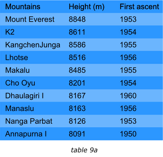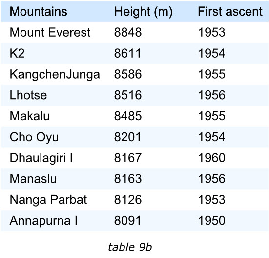 表格中的項目應該通過某種排序的手段來滿足閱讀者的興趣。我們來看下面的兩個表格,左面的展示了世界上最高的十座山峰,鑒于“高度”最受關注,那么表格的項目就是按照這個字段降序排列的。這樣最受關注的信息能夠排在表格的最前面。
