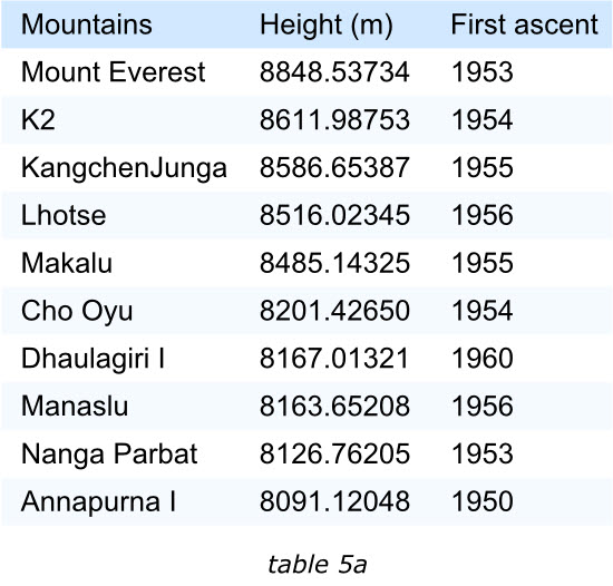 例如:找到最接近8500米的山峰,第二章表格要遠比第一個表格容易。山的高度到毫米顯然沒有必要,他使得讀者誤認為這些數據的確是經過精準測量,然而事實有可能不是這樣。根據讀者的需要提供數據的準確程度,并不會削弱數據的有效性。當然又少部分人會質疑第二章表格的準確性,但是大部分人會想山峰的高度能夠被測量的如此嗎?(山峰每年移動的距離就遠不止于此),甚至還會對從整體上對數據的有效性以及及時性提出質疑。