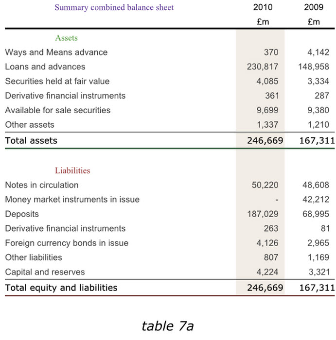 在表格中尋找信息時,讀者希望前后采用同樣風格,你應該保證對同類元素使用同樣的字體,對同類數據使用同種對齊方式,還有諸如“列標題”等各種突出顯示元素的一致性。看一下下面的表格7a,他展示了和前面表格1b同樣的英格蘭銀行2010年度數據信息。但是使用了有區分的表頭字體,標簽以及加總格式,表頭采用了居中格式而不是和數據一樣右對齊,加總數據也沒有與數據嚴格對齊,同時為了區別資產和負債表格,他分別采用了不同顏色的字體,和表格中間粗細不同的線條。而所有這些實際上都讓我們產生一種不連貫的感覺,從而給瀏覽表格,把握重點帶來難度。