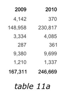 在表格10a和10b中我們已經了解到,當數據處于一列的時候,人們很容的可以比較數據并發現趨勢。瀏覽者可以快速的從上之下掃描縱向數據,而對于長距離的橫向數據,瀏覽就會遇到困難。然而我們再來看一下表格11a,去掉了所有的裝飾框,當我們比較2009年和2010年數據的時候,數據橫向擺放要比11b中的上下擺放容易的多。